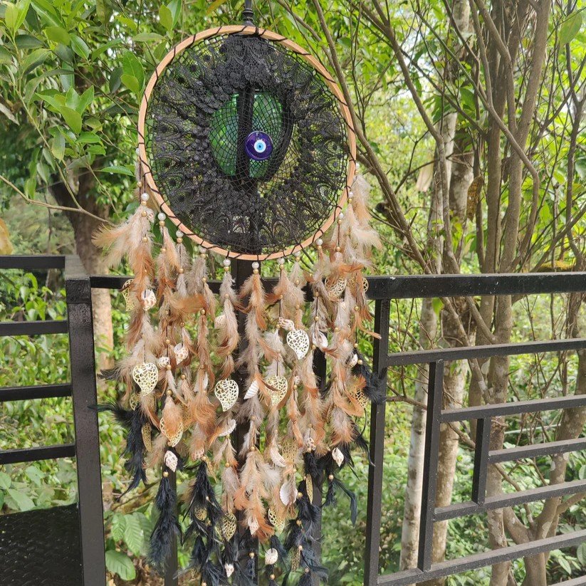✨ Materials: Wooden ring, lace, thread (cobweb work), feathers, metal charms