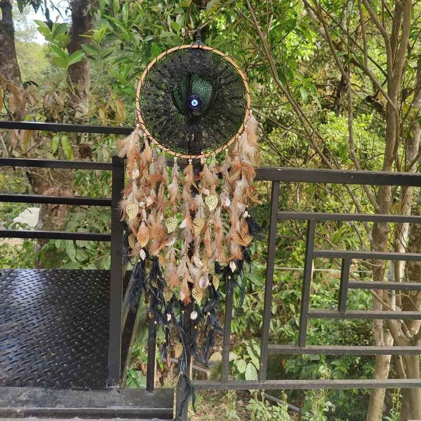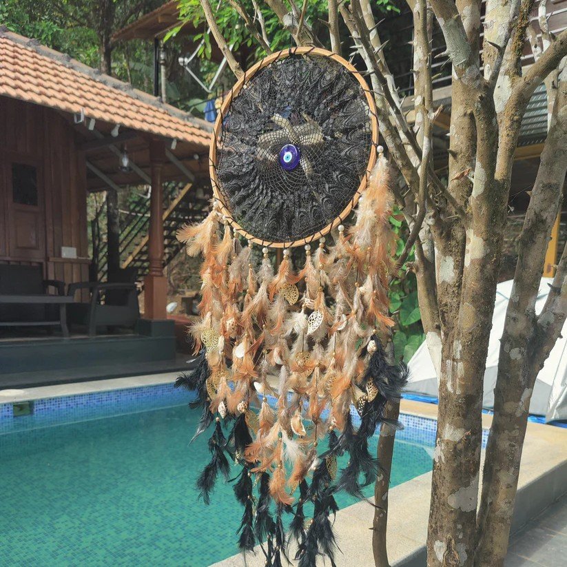Bring urban elegance and boho charm into your space with the Onyx Black Urban Dreamcatcher. Featuring a wooden ring wrapped with intricate lace and cobweb design, this dreamcatcher is adorned with high-quality feathers and metal charms that add texture, depth, and movement. The striking shades of black paired with urban feathers create a sophisticated yet earthy feel, making it a perfect centerpiece for any room.