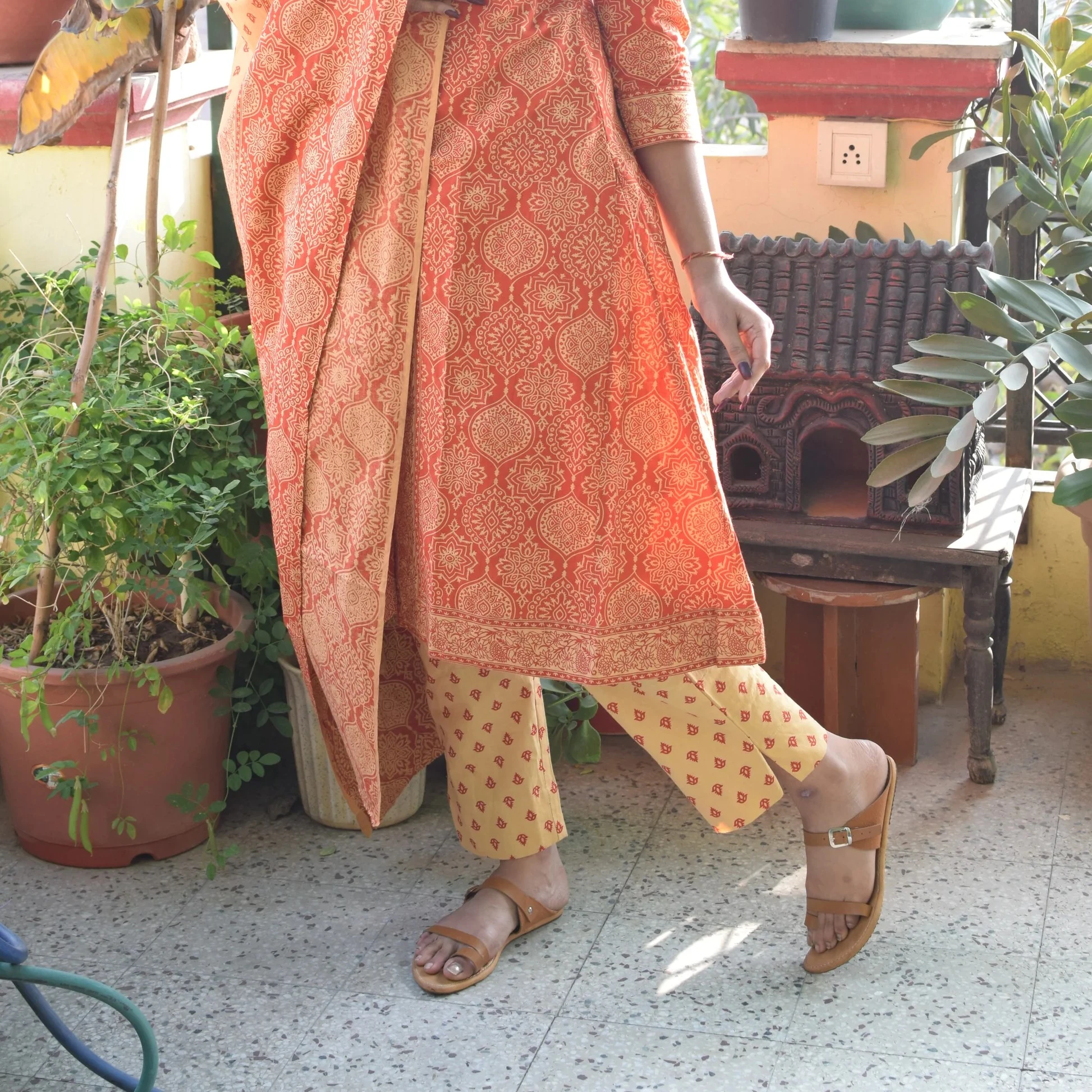 Styled in a cheerful orange colour with traditional Sanganeri block‑print motifs—an artisanal touch rooted in heritage.