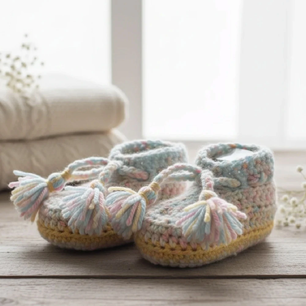Wrap your baby's feet in the dreamy comfort of our "Pastel Dream" Tassel Booties. Lovingly handmade from the softest, authentic wool, these booties feature a beautiful mix of light blue, pink, and yellow pastel colors.