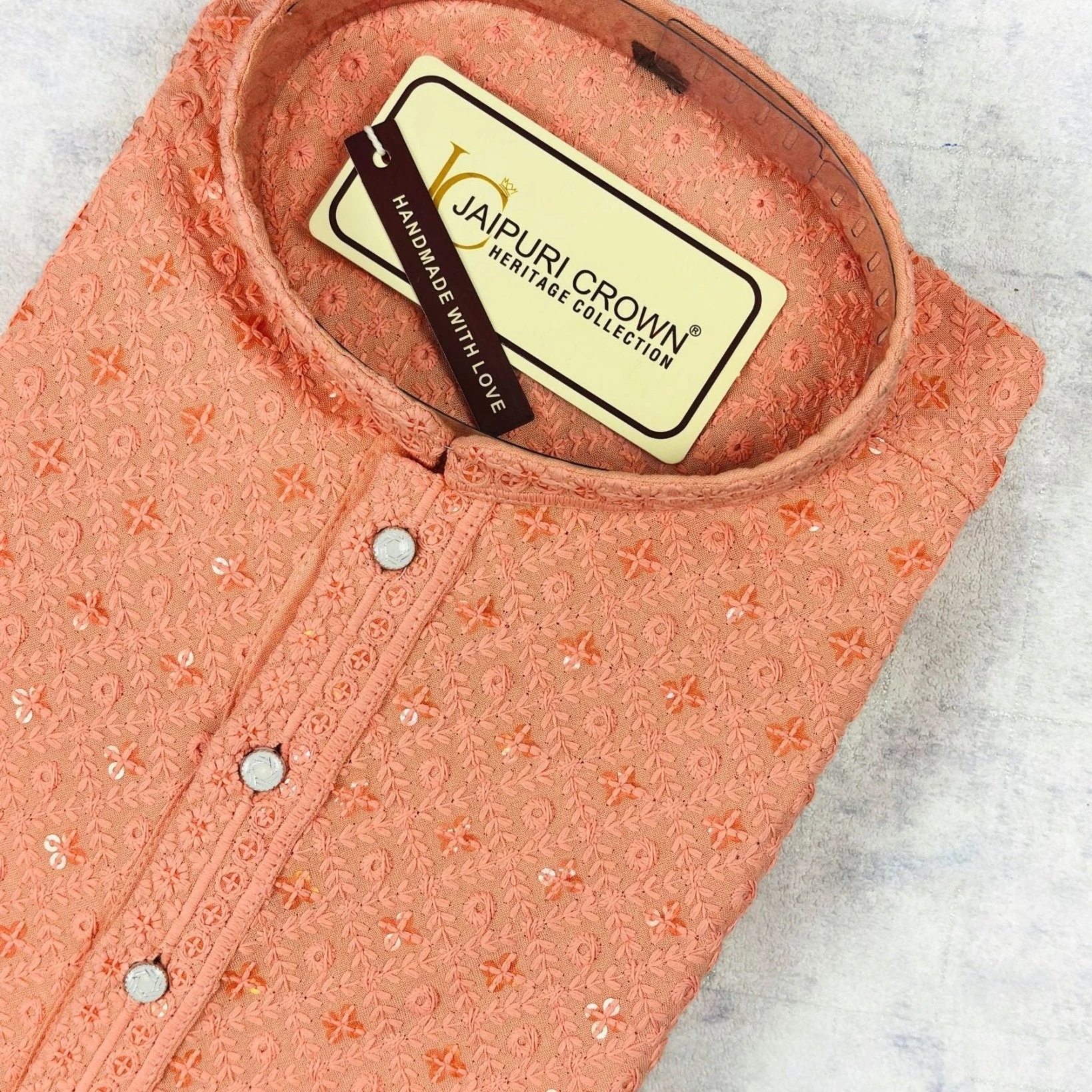 Refresh your ethnic wardrobe with the Peach Square Lucknowi Kurta. Crafted from 100% premium cotton, this kurta features a soft peach-colored base adorned with subtle square-motif detailing inspired by traditional Lucknowi craft. The straight-cut silhouette with full sleeves and mandarin collar offers both comfort and sophistication—perfect for festive gatherings, cultural events or elevated everyday wear.