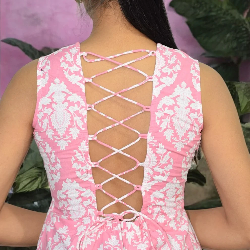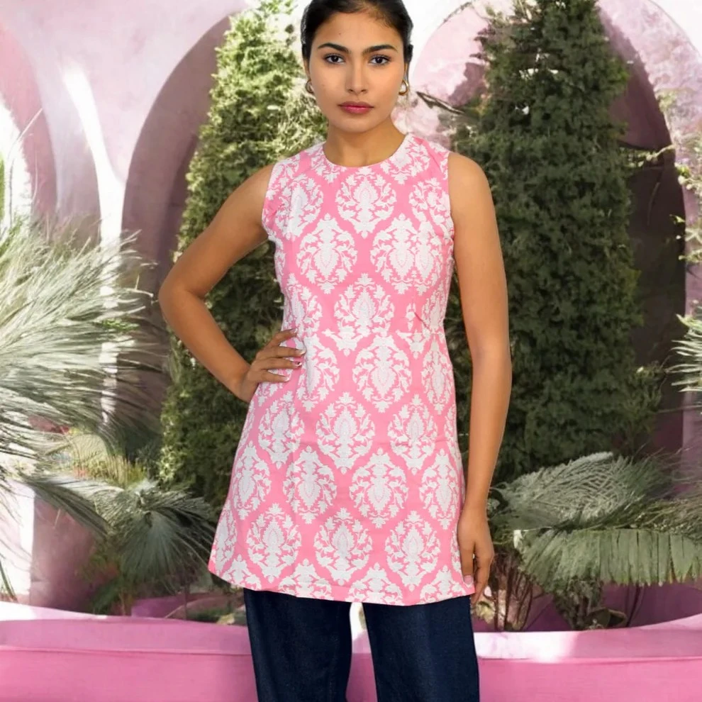 Elevate your wardrobe with the Pink Taj Backless Short Kurti, a fusion of traditional craftsmanship and contemporary design. Crafted from soft, breathable cotton, this kurti features a vibrant pink base adorned with traditional Jaipuri hand block prints. The backless design adds a daring, fashion-forward touch, making it ideal for those who love to make a statement.