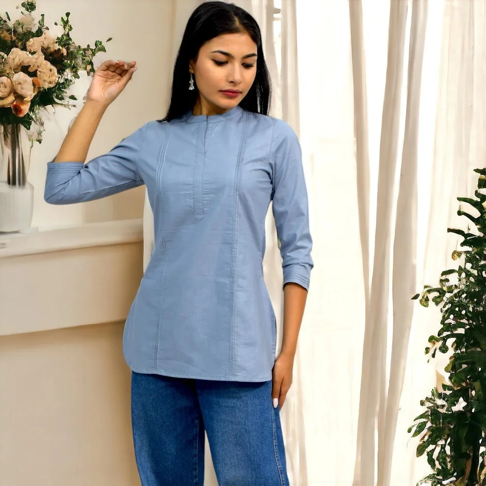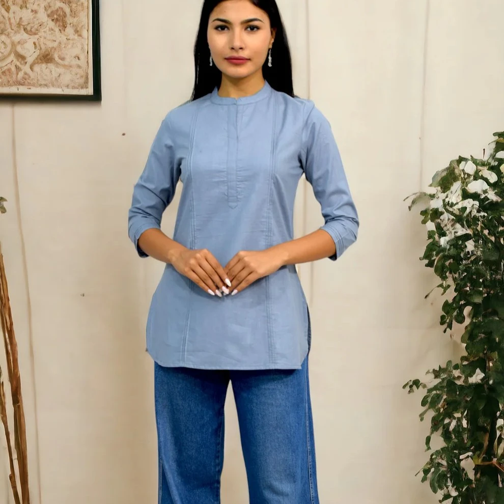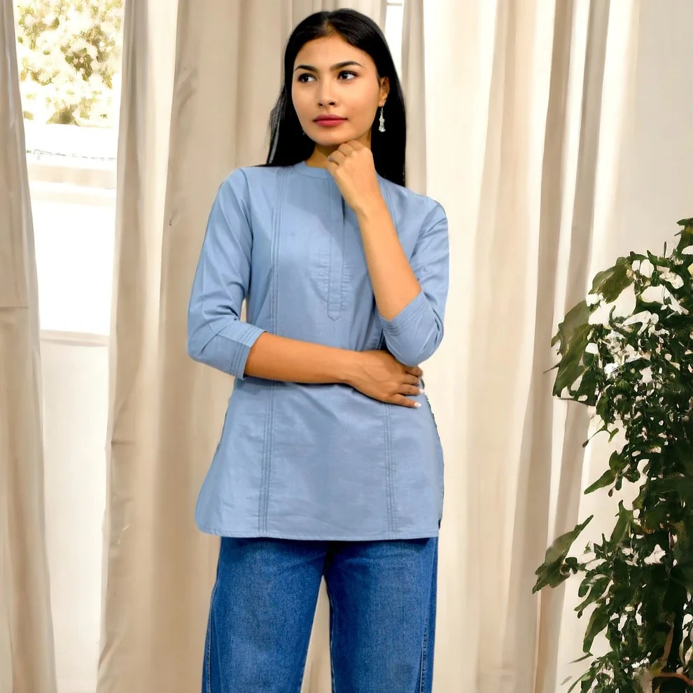 Elevate your wardrobe with the Pintex Blue Plain Short Kurta, blending traditional craftsmanship with modern style. Made from 100% pure cotton, this kurta features a rich blue base with subtle pintex detailing on the mandarin collar, adding sophistication. The 3/4 sleeves and regular fit ensure comfort, making it ideal for casual outings, workwear, or festive occasions.