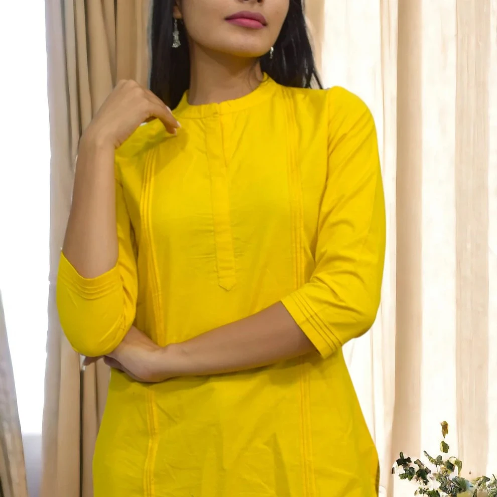 Embrace the warmth of summer with the Pintex Yellow Plain Short Kurta, a perfect blend of traditional craftsmanship and contemporary design. Made from 100% pure cotton, this kurta features a vibrant yellow base with subtle pintex detailing on the mandarin collar, adding a touch of sophistication. The 3/4 sleeves and regular fit ensure comfort and style, making it suitable for various occasions.