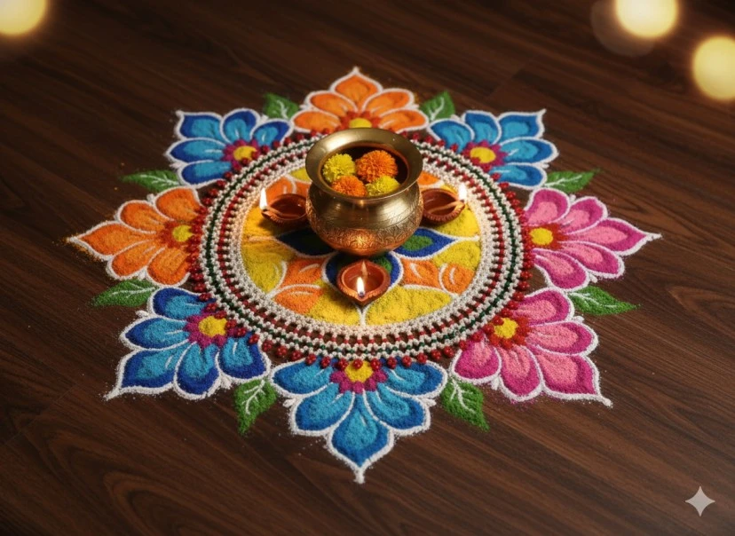 Rangoli: Used as a substitute for traditional powder rangoli, often placed on tables or floors, particularly for the Chaitrangan or Rukhwat (wedding decoration).