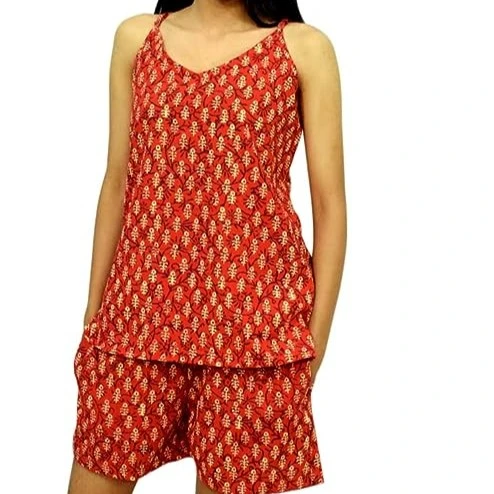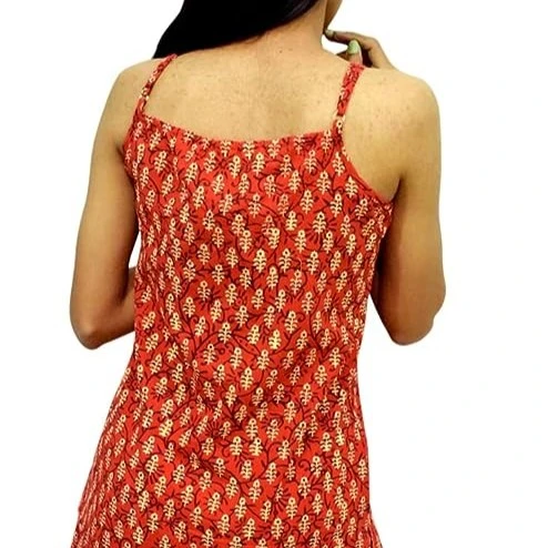 Features a vibrant red base colour with printed motifs throughout, giving a stylish and relaxed look.