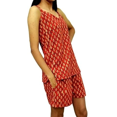 Set includes one sleeveless printed top and one elastic-waist printed shorts with side pockets for ease.