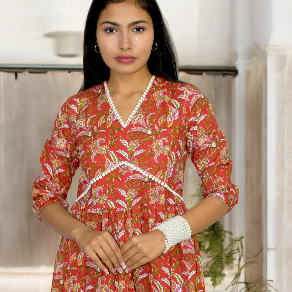 Striking Red base colour with “Taj” motif accents for a chic and feminine look.