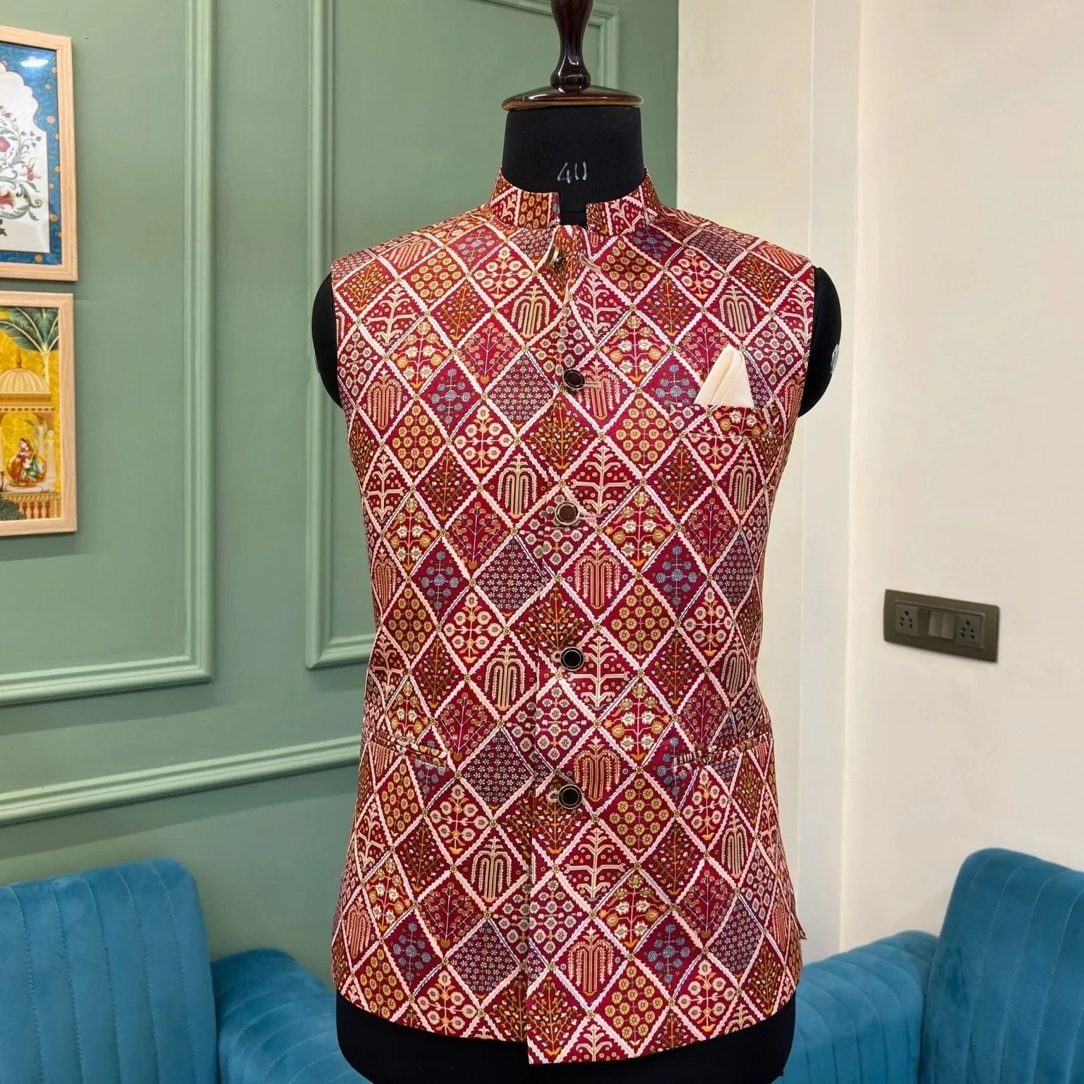 Step into refined ethnic elegance with the Regal Heritage Modi Jacket. This hip-length jacket features a rich heritage-inspired print, mounted on premium fabric with a mandarin collar and button-front closure. Designed for weddings, festivals and special occasions, it layers seamlessly over a kurta or shirt while adding a polished traditional edge to your ensemble.