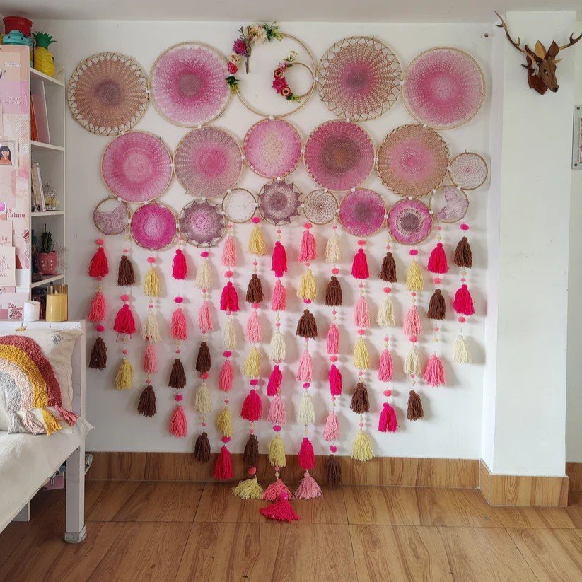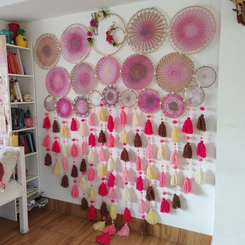 Measuring 6ft × 6ft, this dreamcatcher can be displayed as a wall décor, backdrop, or curtain, making it a thoughtful gift or a stunning focal point in your home. Each handmade piece is unique, radiating both artistry and boho elegance.