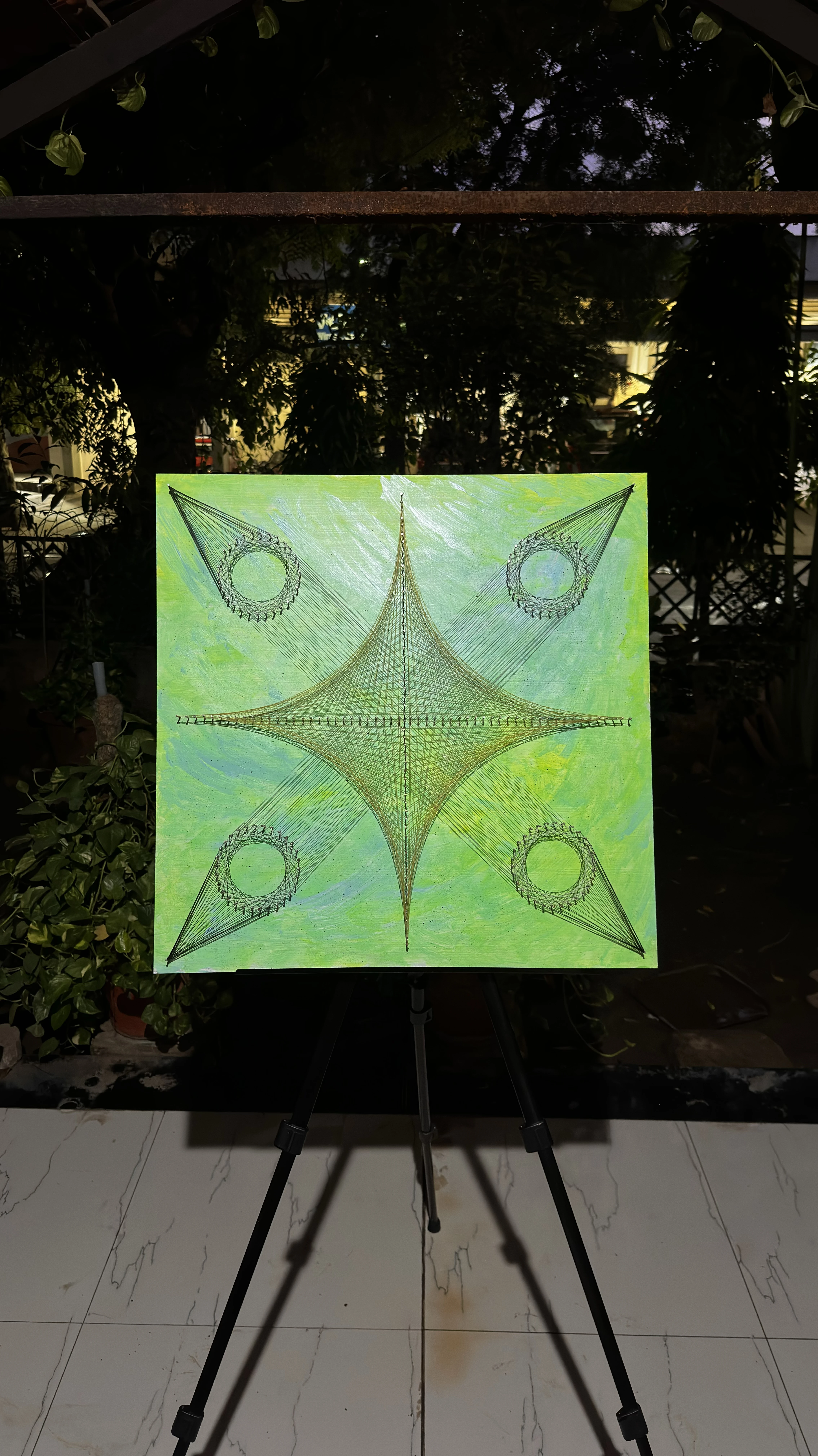 This captivating string art piece is a vibrant expression of symmetry, balance, and creative energy, designed to be a centerpiece for any modern space.