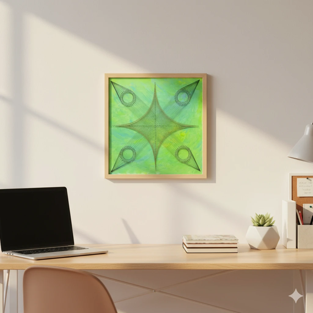 This artwork is built upon the principle of geometric harmony, where every line and curve contributes to a perfect, balanced whole. The striking background—a blend of Lime Green and vivid turquoise—invokes feelings of vitality, growth, and tranquility, making it an excellent focal point for positive energy.