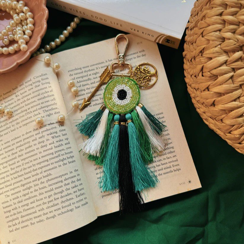 Protective Bohemian Charm – Featuring a symbolic evil eye for warding off negativity, accented with playful tassels and a cowbell for added good-luck energy