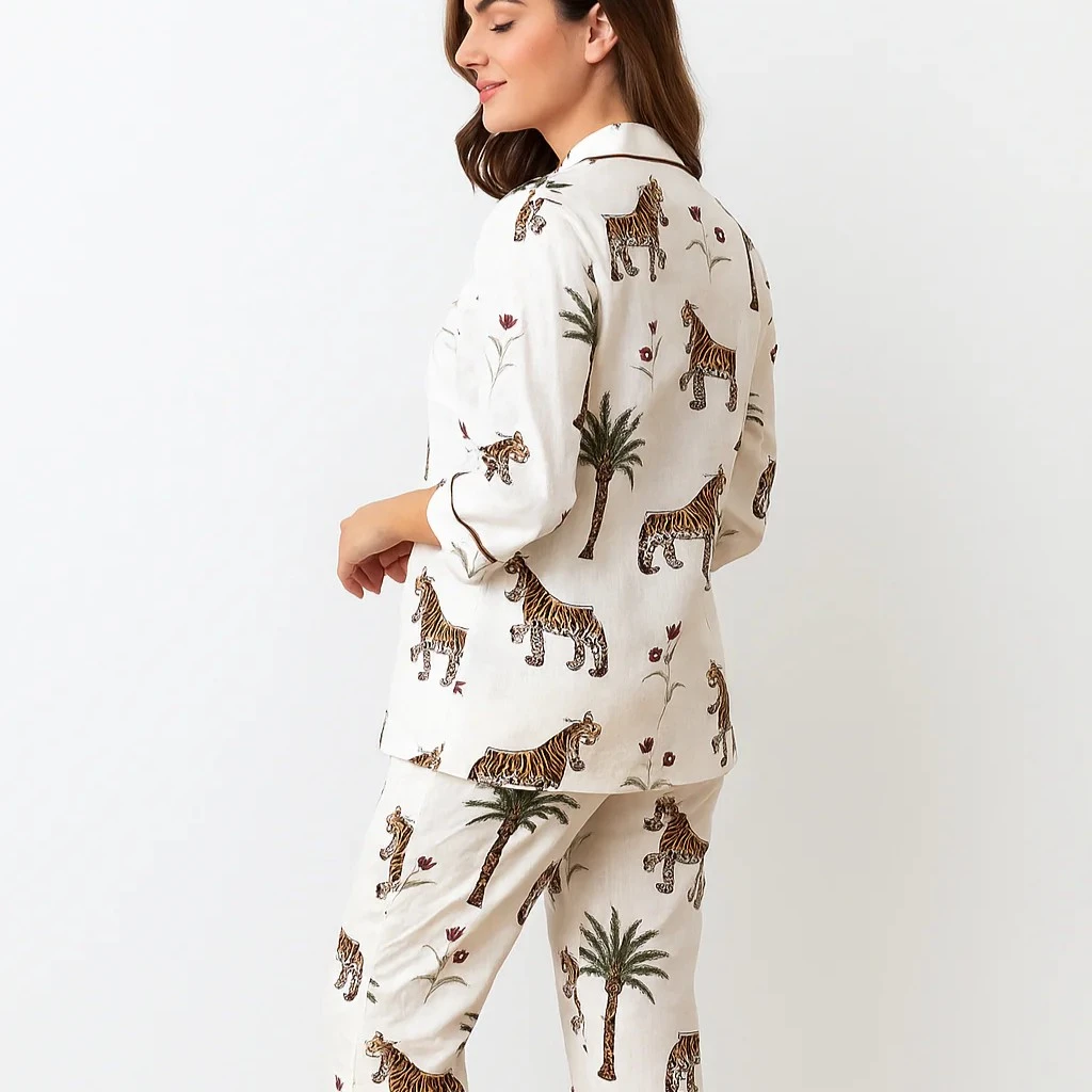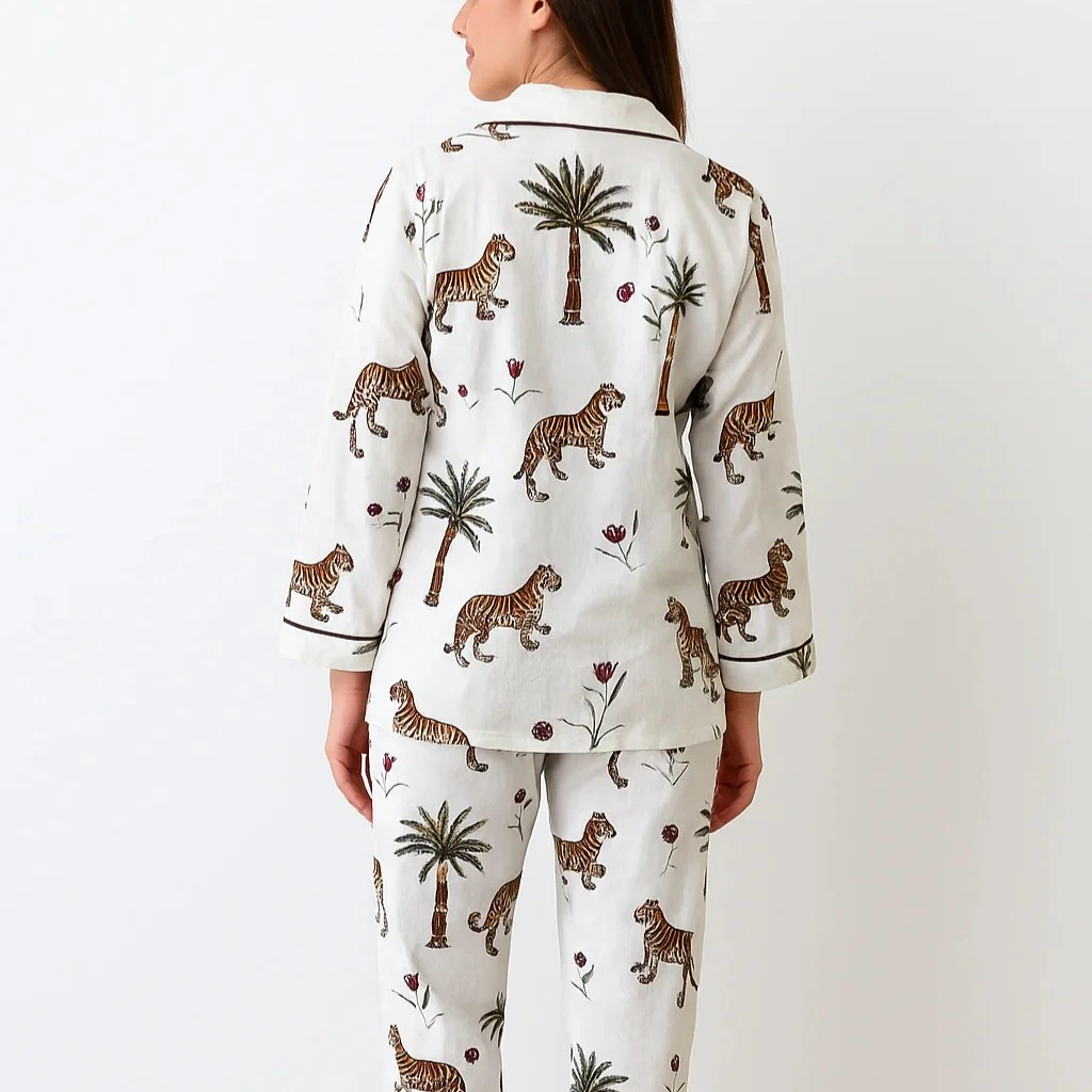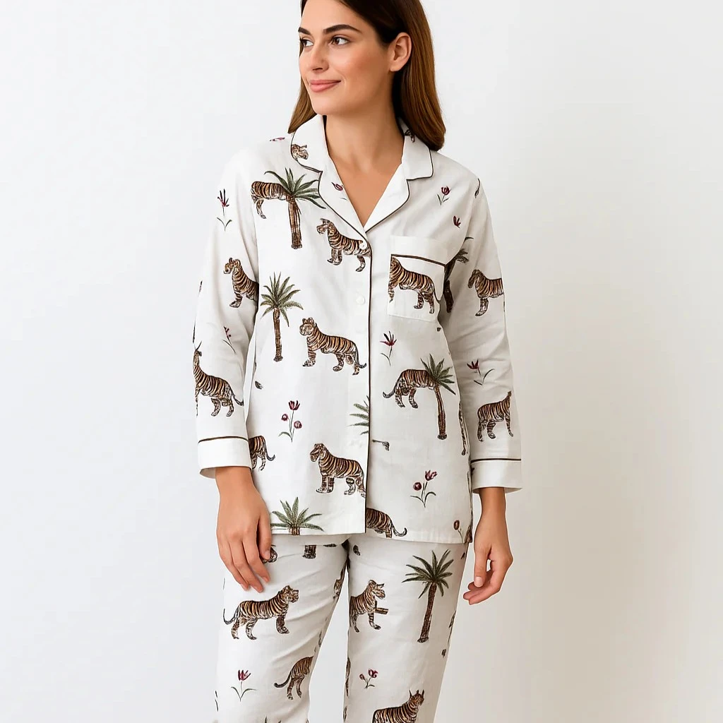 Tame the night in elegant comfort with this Women White Jungle Print Night Suit. Crafted in soft, breathable pure cotton, this pajama set features a crisp white base adorned with hand-block jungle motifs. The full-sleeve button-down top is detailed with piping along the edges, while the matching bottoms offer an elastic waistband for relaxed wear. Designed for style and ease, this set brings sophistication to bedtime and lounge moments.