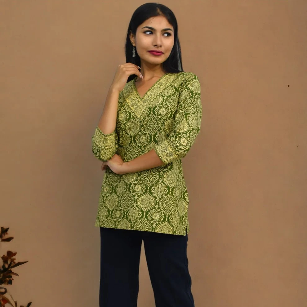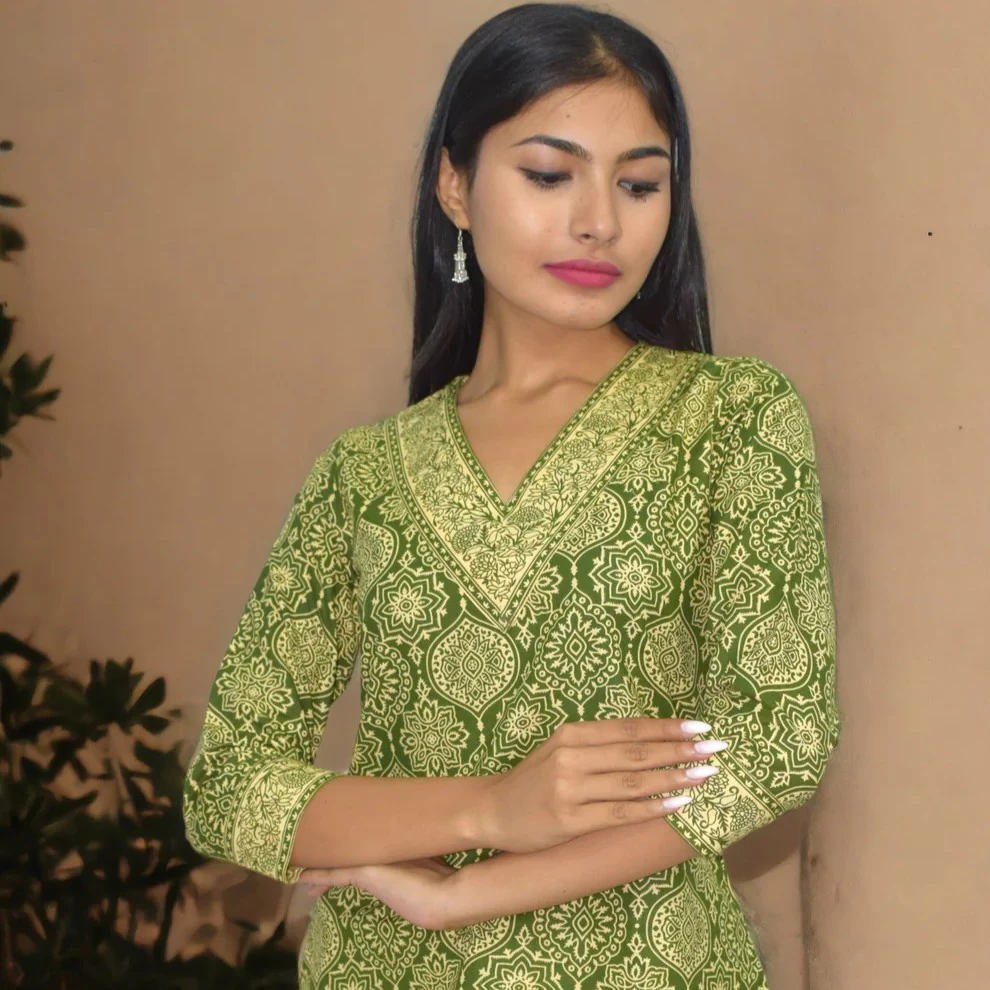 Infuse your wardrobe with artisan charm and comfortable elegance with this Women’s Mughal Green Cotton V-Neck Short Kurti. Crafted from soft, breathable 100% cotton and featuring authentic hand-block printed design, this kurti captures the relaxed yet refined spirit of contemporary ethnic wear.