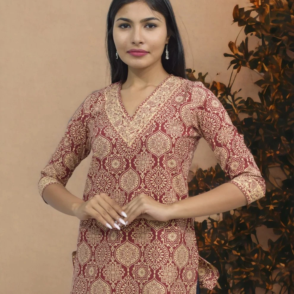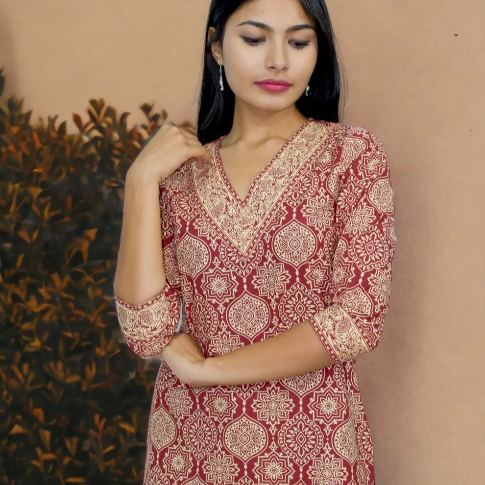 Elevate your everyday ethnic style with this Women’s Mughal Red Cotton V-Neck Short Kurti. Crafted from soft, breathable 100% pure cotton, this kurti features a flattering V-neckline and a short-length silhouette that’s perfect for casual outings and relaxed gatherings.