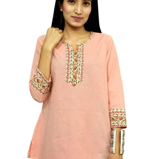 Design: Short kurti length, modern neckline (V-neck or broad depending), straight/regular fit.