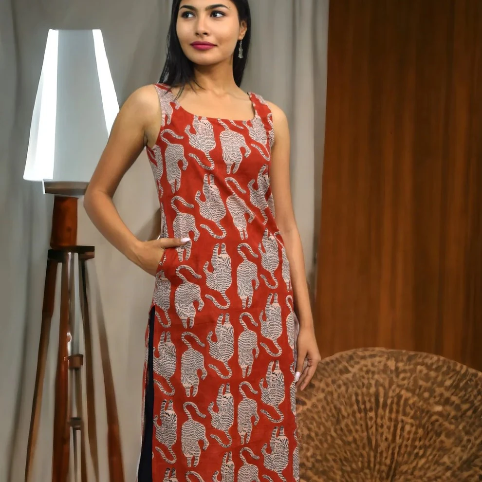 Inject artisan charm and elevated everyday style into your wardrobe with this Tiger-Print Hand-Block Broad Long Kurti. Crafted in breathable cotton and featuring a broad silhouette and hand-block-printed tiger motif, this kurti blends comfort, craft and confidence in equal measure.