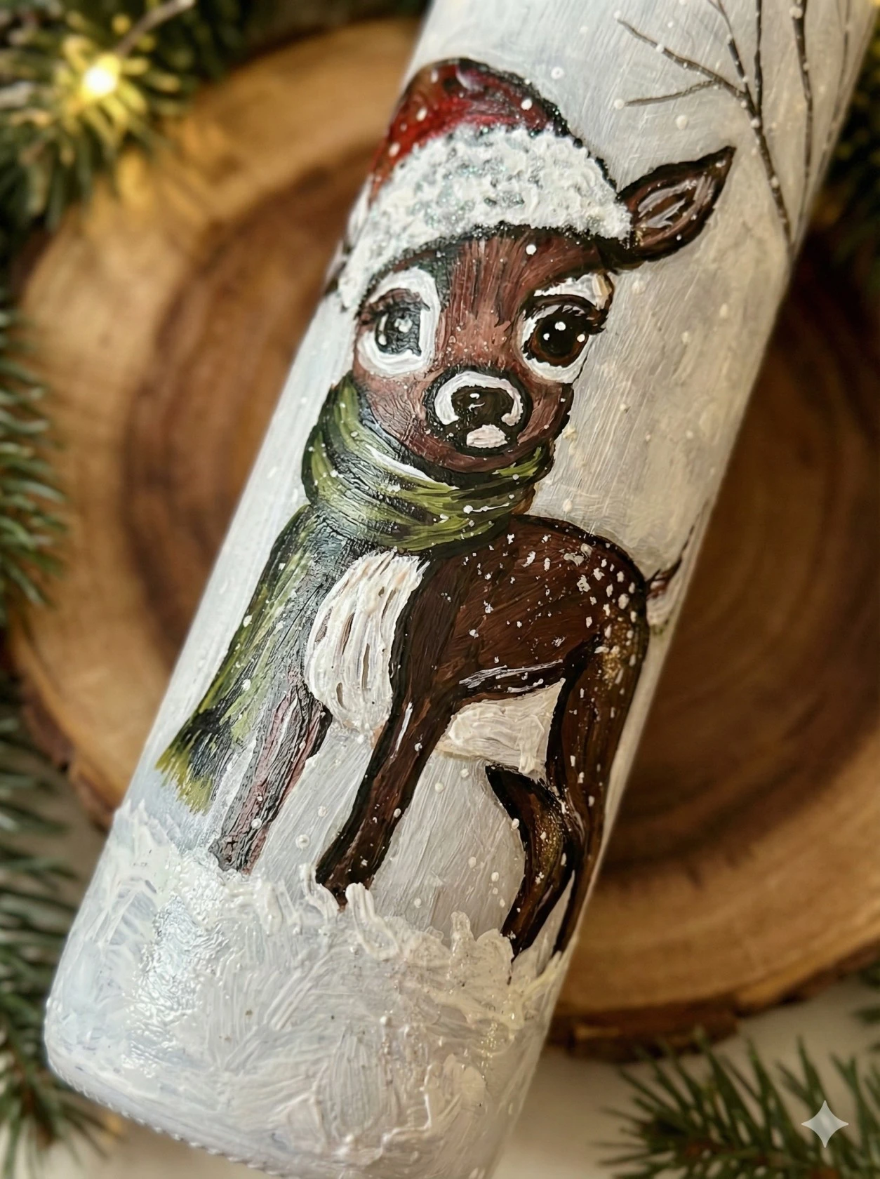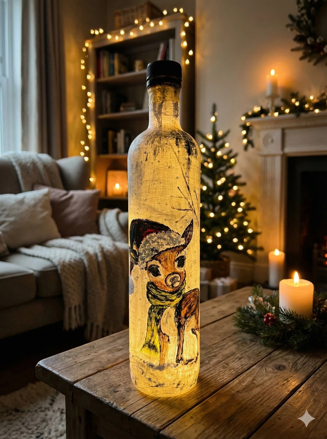 Brighten up your Christmas celebrations with this adorable hand-painted bottle lamp from Svamart. Featuring a heartwarming illustration of a wide-eyed baby fawn (reindeer) bundled up for winter, this piece captures the innocent joy of the holiday season.