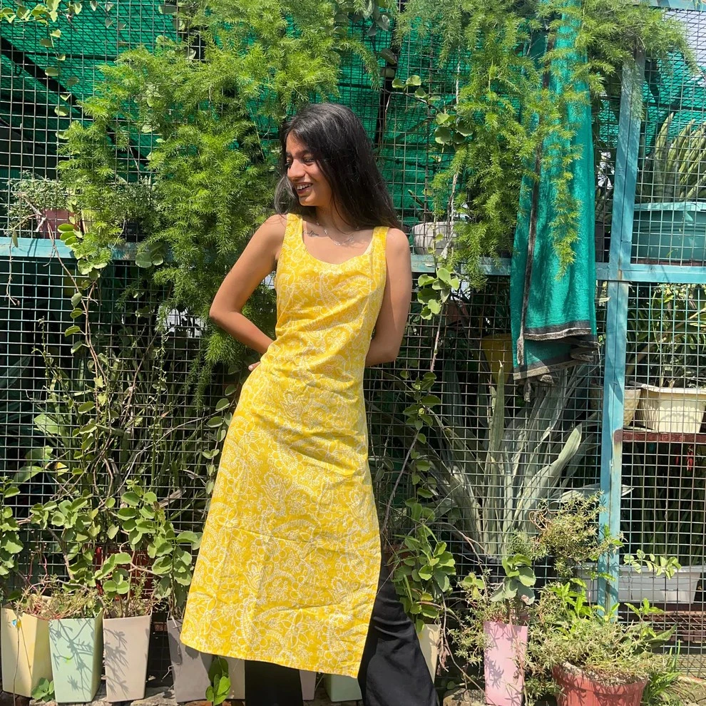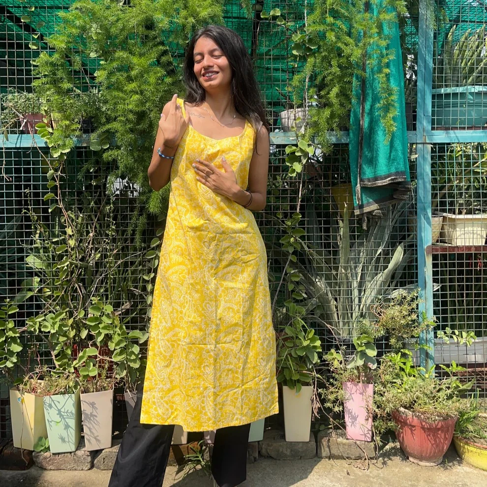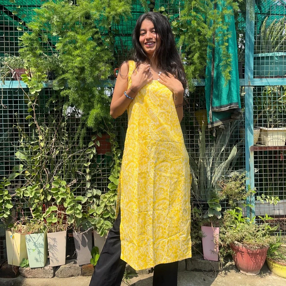 Add a touch of traditional elegance to your wardrobe with the Yellow Handblock Broad Long Kurti. Crafted from 100% pure cotton, this kurti features a vibrant yellow base adorned with intricate hand block prints using Sanganeri and Bagru techniques. The broad neck design and 42-inch length offer a flattering silhouette, while the side pocket adds a practical element.
