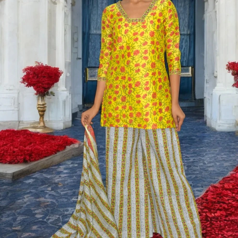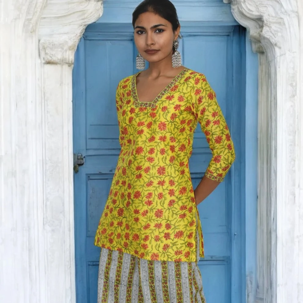 Colour: Bright yellow base accentuated with elegant prints or subtle motif detailing.