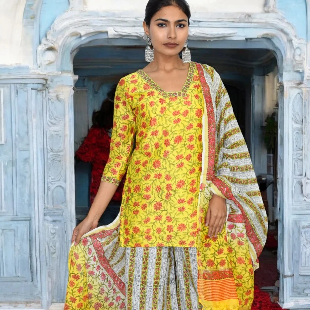 Style & Fit: Ready-to-wear, full-stitched suit set which includes a top (kurta), bottom (matching trousers or palazzo) and a matching dupatta for a coordinated look.