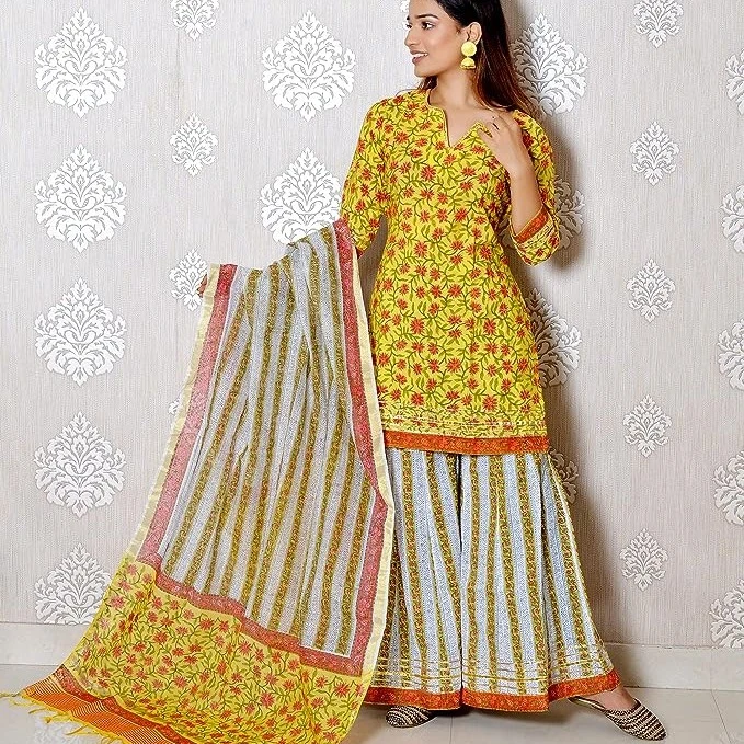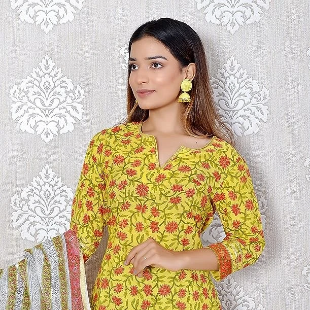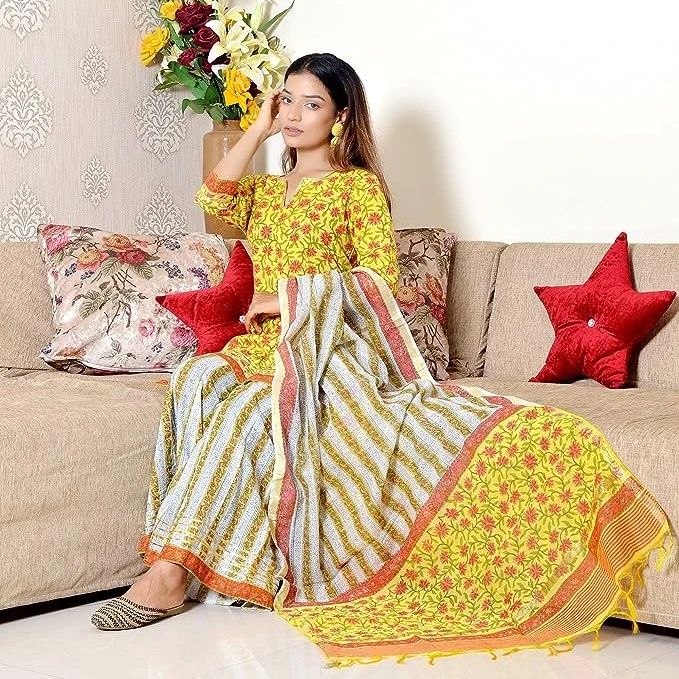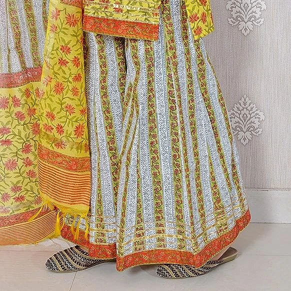 Colour & Design: Bright yellow base with traditional block-print motifs and gota work details for a festive touch.