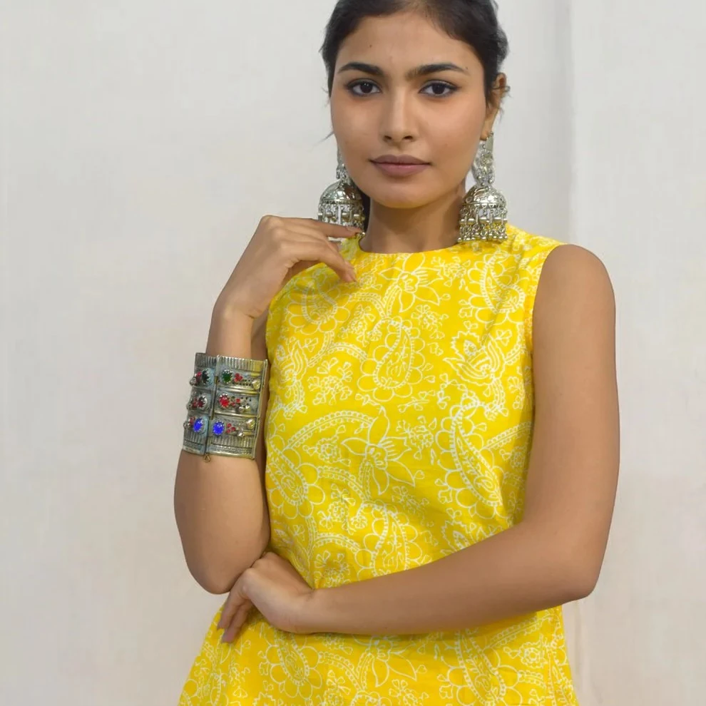 Colour & Design: Bright yellow hue with an “umbrella-cut” silhouette (the top flares out like an umbrella) for a flattering flow and relaxed fit.