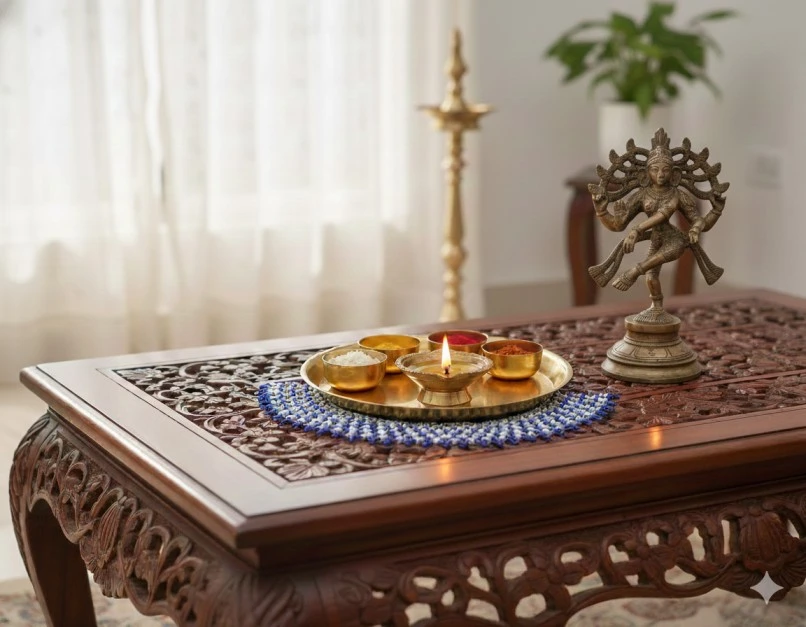 a substitute for traditional powder rangoli, often placed on tables or floors,