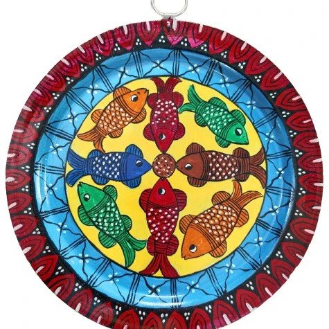 Hand-painted Patachitra wall decor on an aluminium plate, showcasing a vibrant arrangement of fish, symbolizing prosperity and vitality in traditional Indian art.
