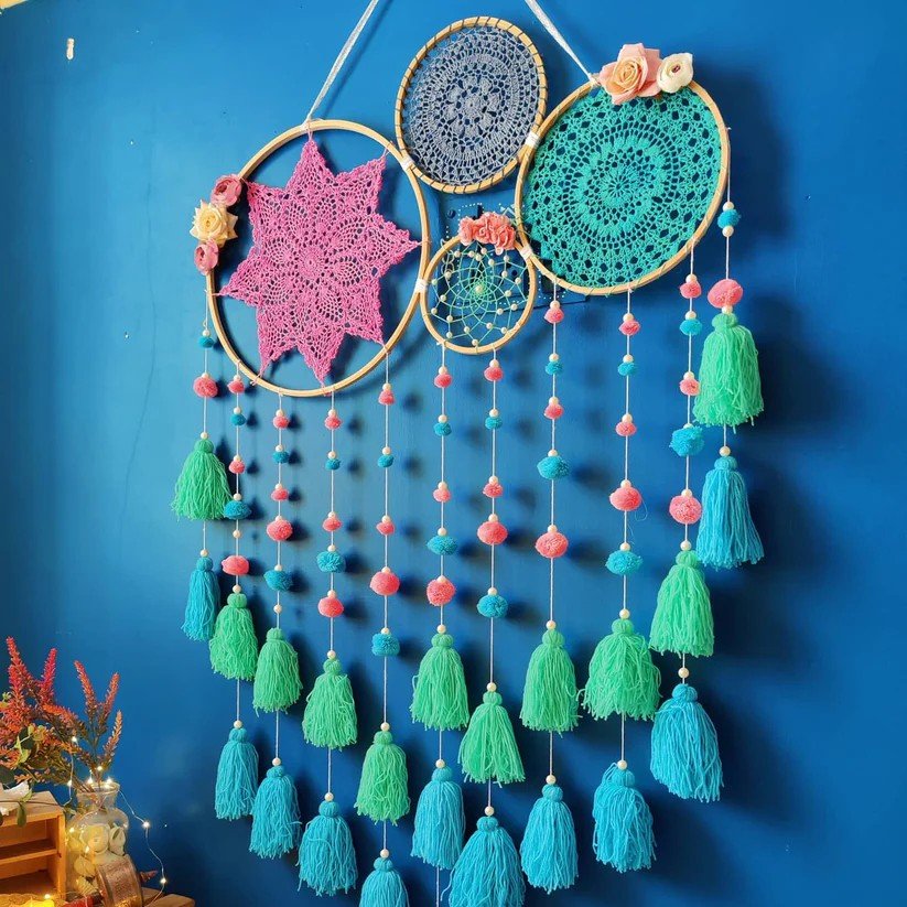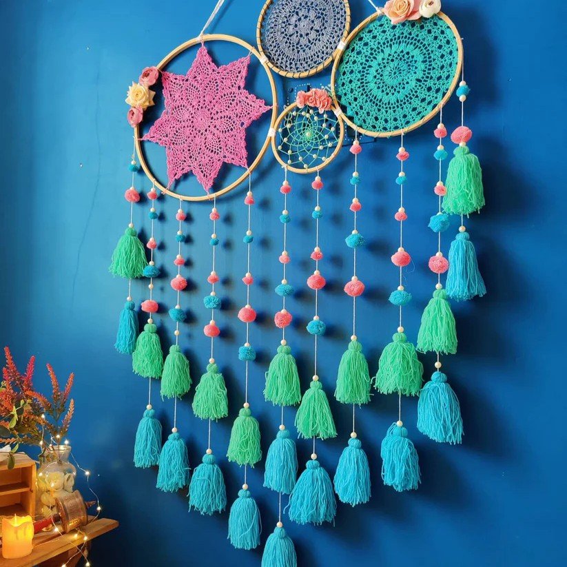 Bring home soft elegance with our Baby Pink Grace Dreamcatcher, crafted to add charm and positivity to any space. Handmade using wooden rings, crochet, threads, and artificial flowers, this dreamcatcher blends artistry with bohemian style.