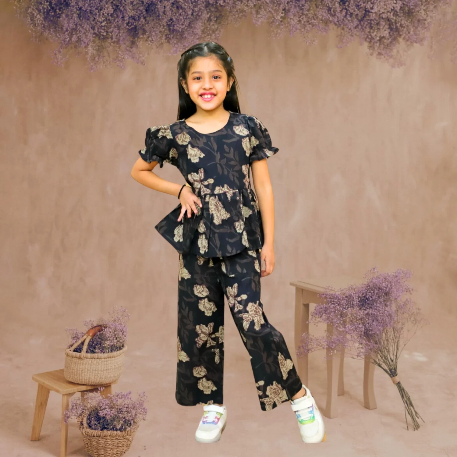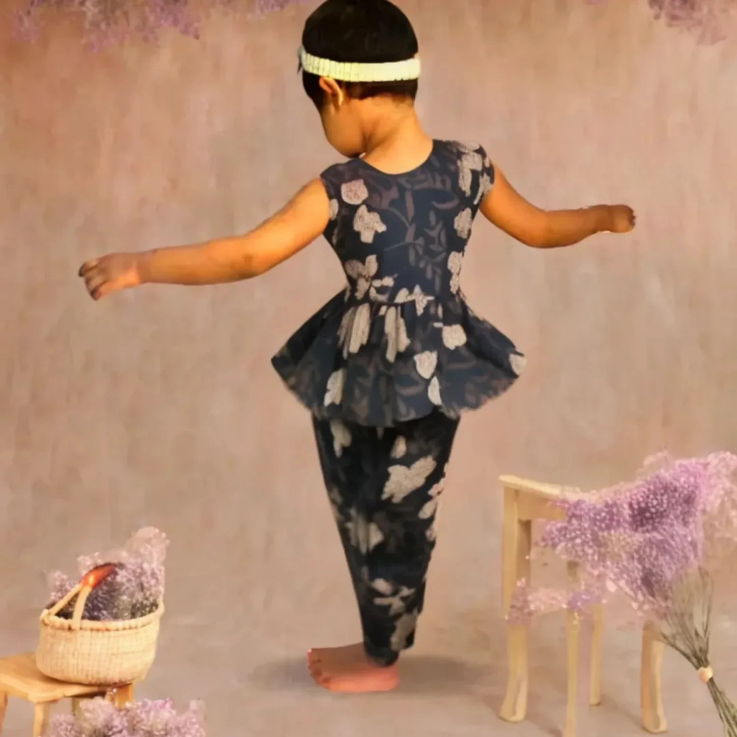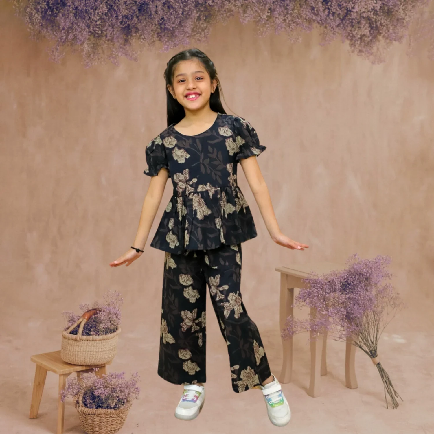 Give her wardrobe a graceful touch with this Black Peplum Top & Pants Dress. The flared peplum top layered over matching pants creates a chic one-piece illusion, perfect for festive wear, parties, or special occasions. Crafted from breathable pure cotton, this ensemble balances style and comfort, making sure she shines without compromising on ease.