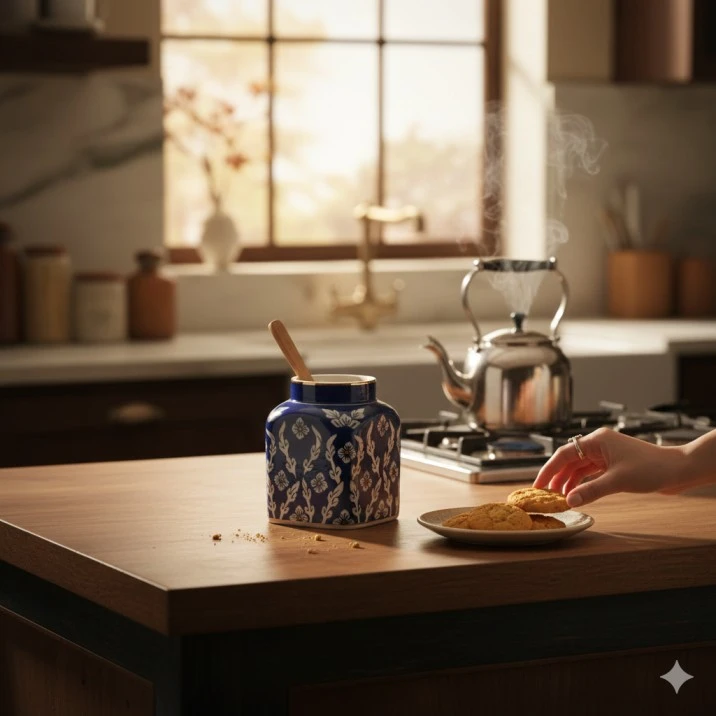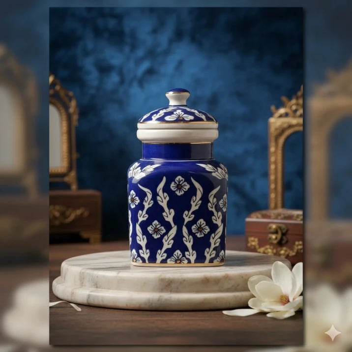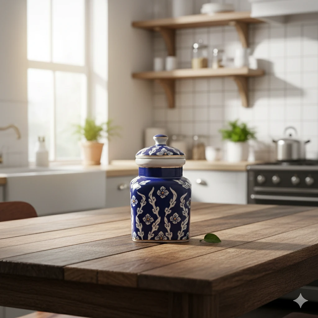 Elevate your kitchen aesthetic with this stunning, handcrafted storage jar. Combining the ancient Turko-Persian heritage with the legendary craftsmanship of Jaipur, this piece is more than just a container it is a work of art.