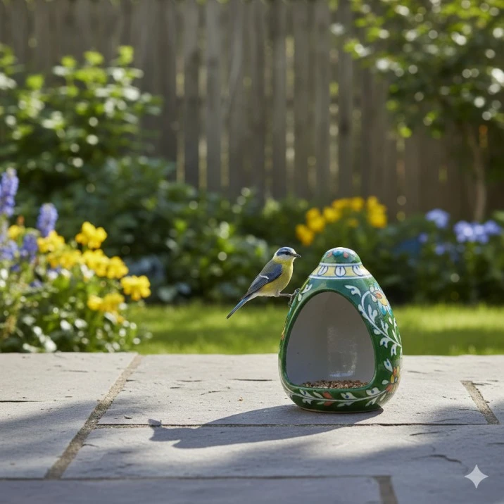 Elevate your garden or balcony with a touch of royal heritage. This exquisite bird feeder is more than just a functional outdoor accessory; it is a piece of living history. Handcrafted by master artisans, it showcases the world-renowned Jaipur Blue Pottery technique a stunning Turko-Persian craft that has been perfected over centuries in the Pink City of India.