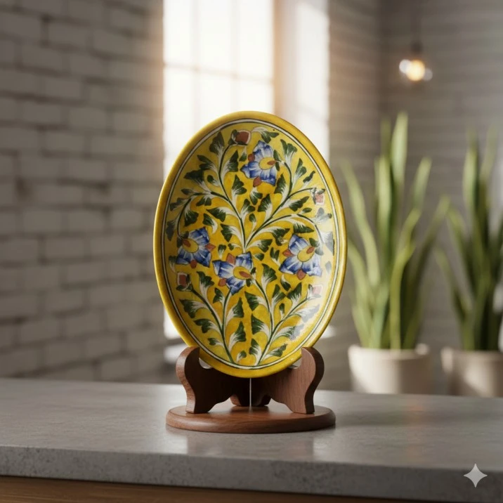 Unlike standard ceramic, Blue Pottery is a unique art form that uses a special Egyptian paste, resulting in a semi-transparent, glass-like finish. This specific piece features a vibrant Yellow Ochre base a rare and premium variation adorned with intricate floral motifs in cobalt blue and emerald green.