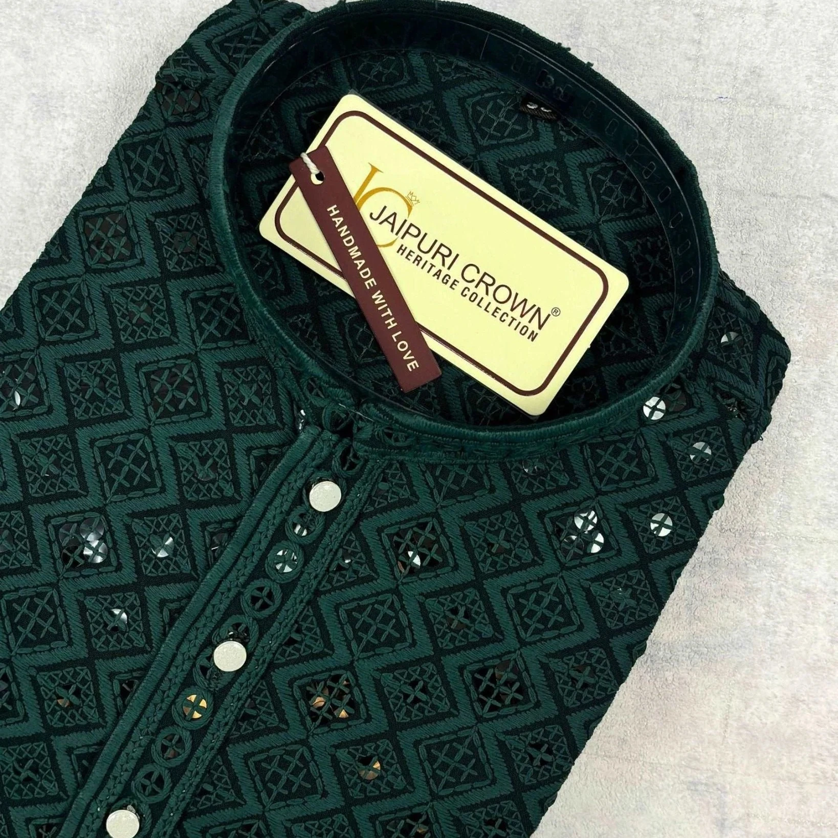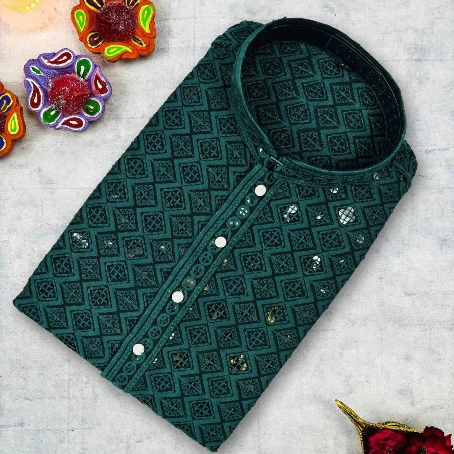 Elevate your ethnic wardrobe with the Bottle Green Square Lucknowi Kurta. Crafted from premium cotton, this kurta showcases a deep bottle-green hue enriched with subtle square-motif detailing inspired by the intricate tradition of Lucknowi textile art. The straight-cut silhouette with full sleeves and a mandarin collar offers both comfort and refined style — perfect for festive gatherings, cultural events or sophisticated everyday ethnic wear.