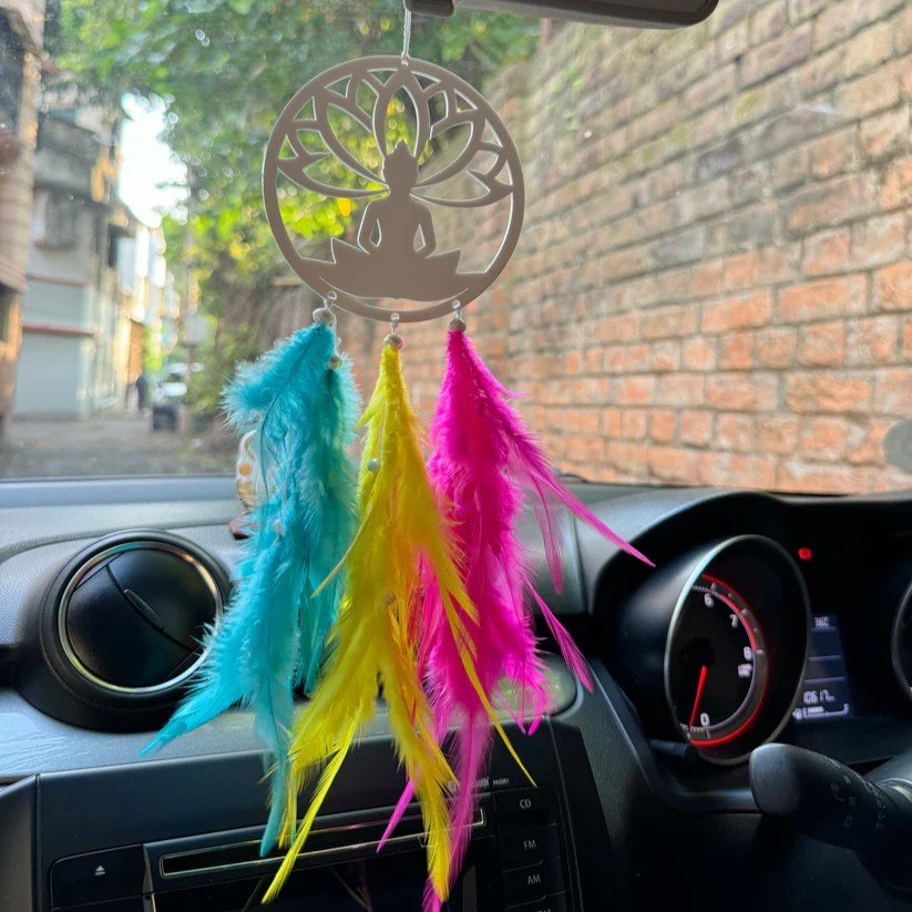 Enhance the peaceful vibes in your car with our Buddha Car Hanging Dreamcatcher. Expertly crafted, it features a serene Buddha design, offering calm, positivity, and good energy on every journey. The vibrant combination of pink, yellow, turquoise, and white adds a cheerful touch while serving as a meaningful and mindful accessory.
