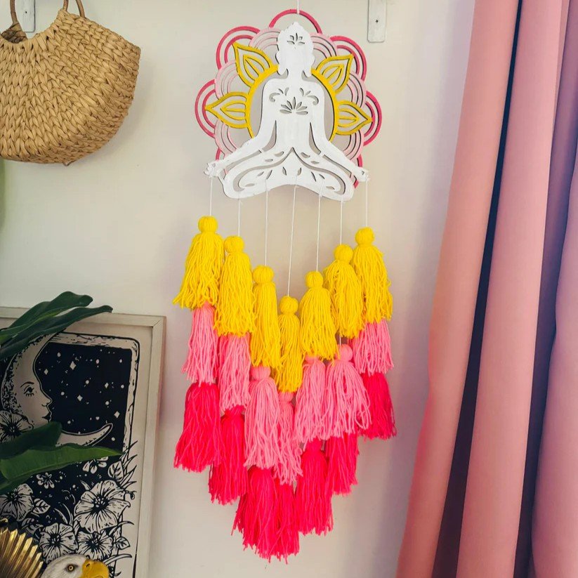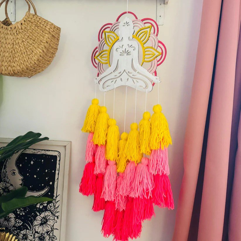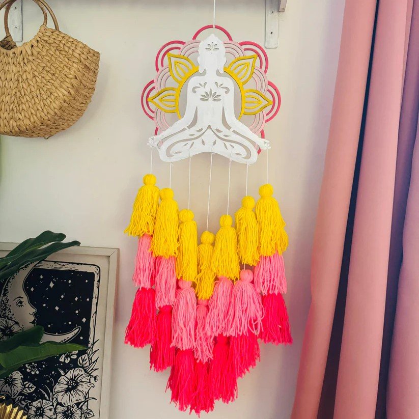 Add warmth and vibrant energy to your living space with the Buddha Colour Tassel Dreamcatcher. Made with wooden rings and threads in soothing shades of yellow, baby pink, and rani pink, this 10-inch diameter and 30-inch height décor piece radiates beauty and positivity. Perfect for gifting or personal use, it brings a bright and charming touch to any room with its boho-inspired design.