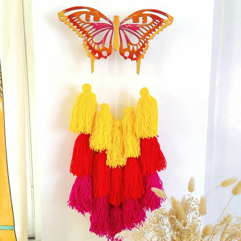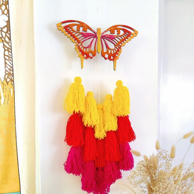 Bring vibrant energy and whimsical beauty to your room with the Butterfly Tassle Dreamcatcher. Made from wool and MDF, this handcrafted piece features colorful tassels that create a playful and bright atmosphere. Ideal for gifting or adding charm to your own space, it perfectly blends boho style with cheerful colors.