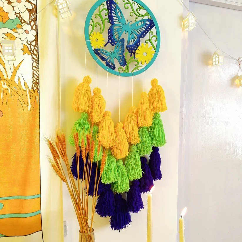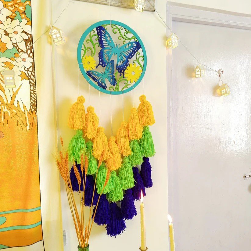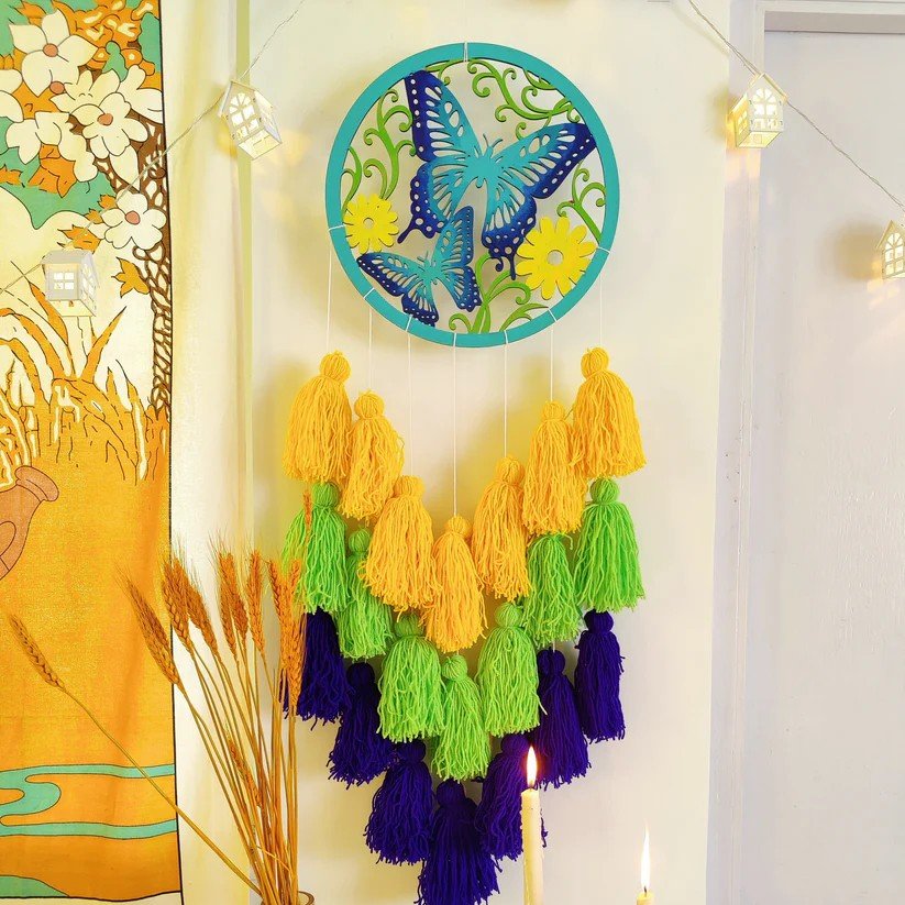 Add a whimsical touch to your space with the Butterfly Tassel Dreamcatcher. Crafted with wool and MDF, its vibrant multi-color design brings life and charm to any room. Perfect for gifting or as a statement piece in your own home, this dreamcatcher embodies boho elegance and cheerful energy.