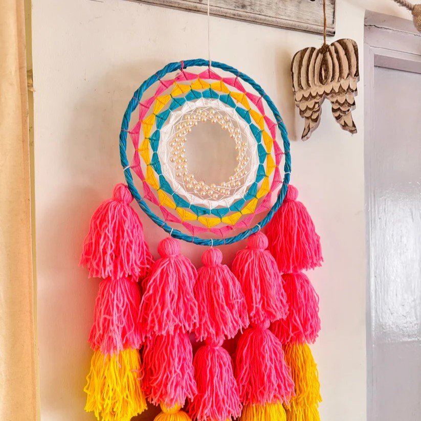 Add a playful and vibrant touch to any space with the Candy Tassel Dreamcatcher. Crafted with a wooden frame wrapped in jacquard cotton and adorned with soft tassels in baby pink, yellow, sky blue, and white, this cheerful piece brings warmth, joy, and a boho flair to your décor. Perfect as a delightful gift or as an eye-catching accent in your own home.