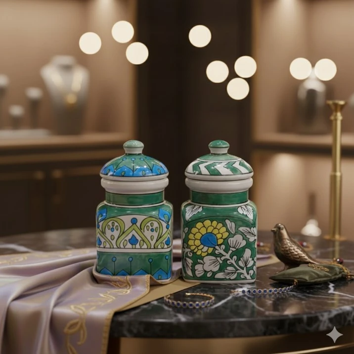 Add a touch of artisanal charm and vibrant color to your kitchen or home with this exquisite set of two hand-painted ceramic storage jars. Each jar is a unique piece, meticulously crafted and adorned with intricate floral, geometric, and abstract patterns in beautiful shades of green, blue, and yellow, showcasing the skill of traditional Indian ceramic artistry.