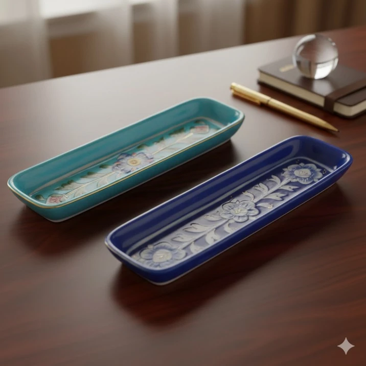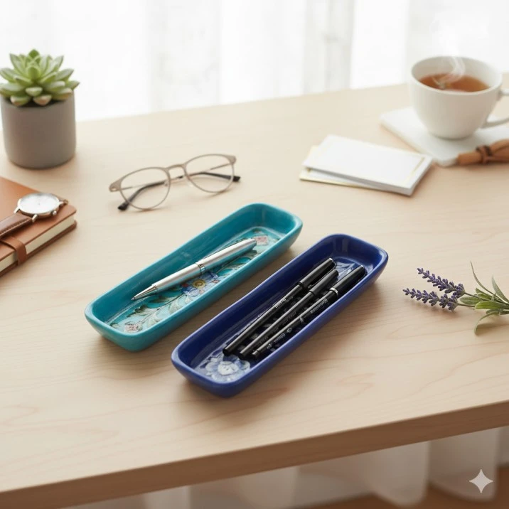 Elevate your workspace with a piece of Turko-Persian history. This 6-inch storage tray is not merely a container but a piece of "Blue Pottery" the legendary craft of Jaipur. Each tray is painstakingly handcrafted using a unique blend of quartz stone powder, glass, and multani mitti (fuller's earth), ensuring a translucent finish and vibrant depth that synthetic ceramics cannot replicate.