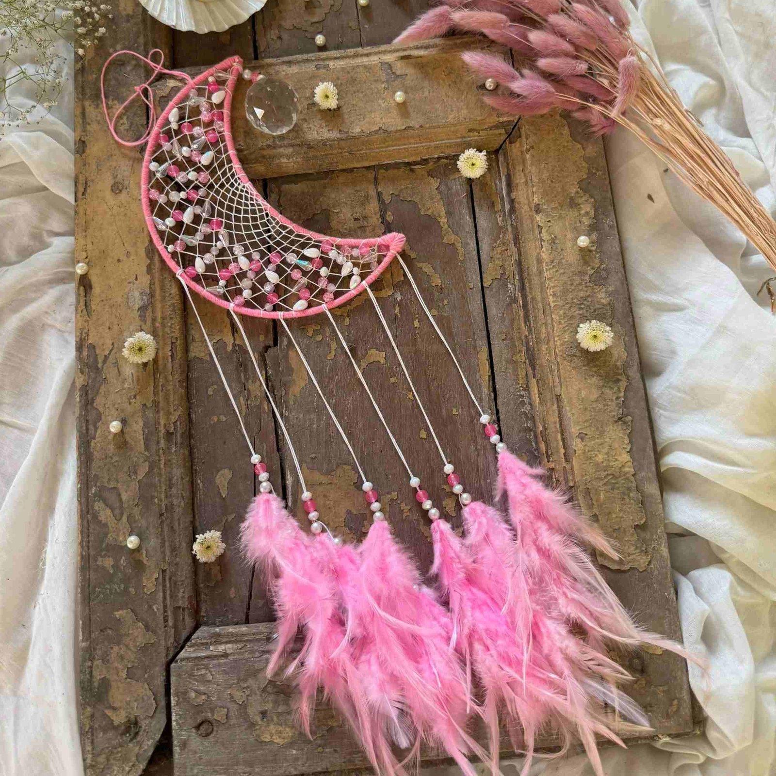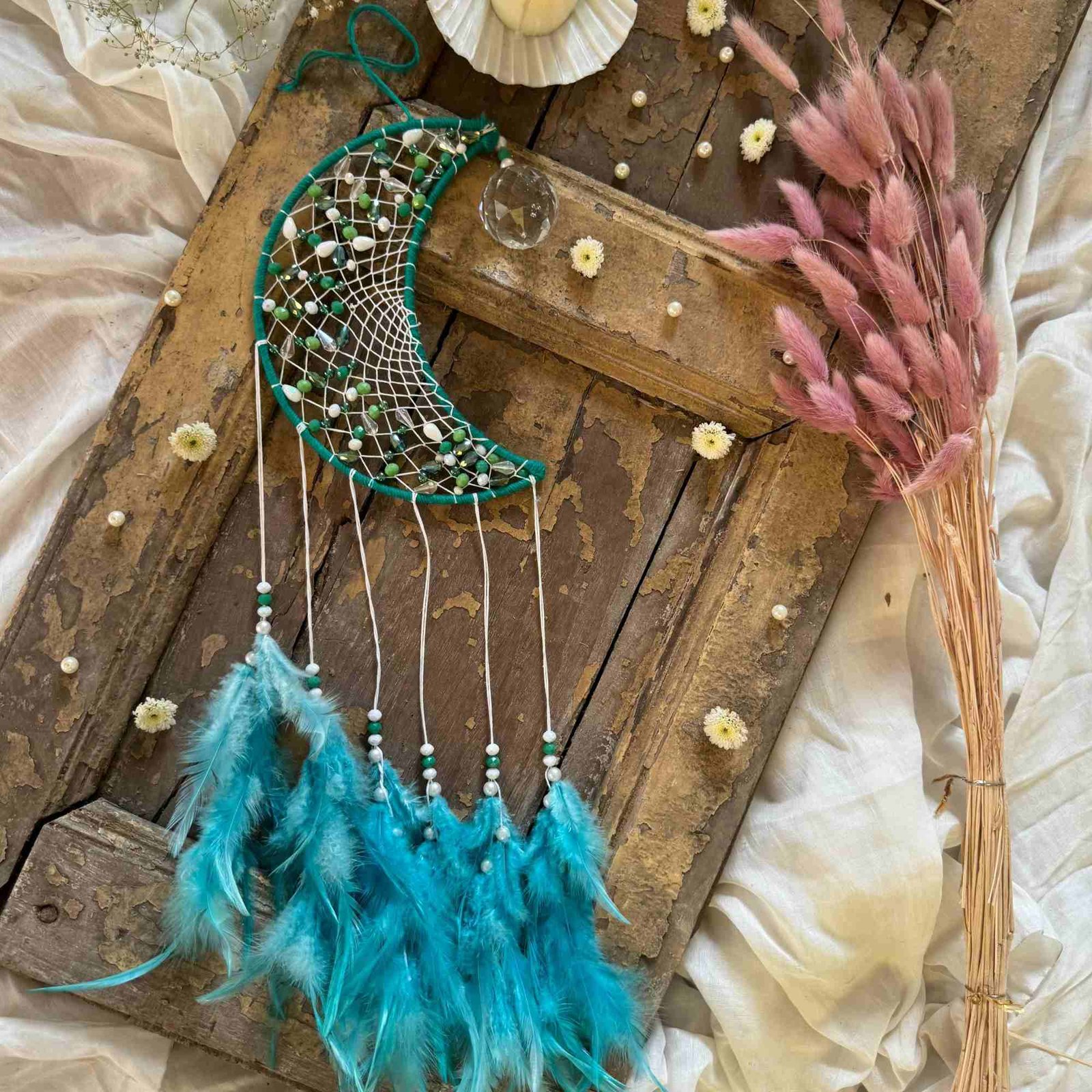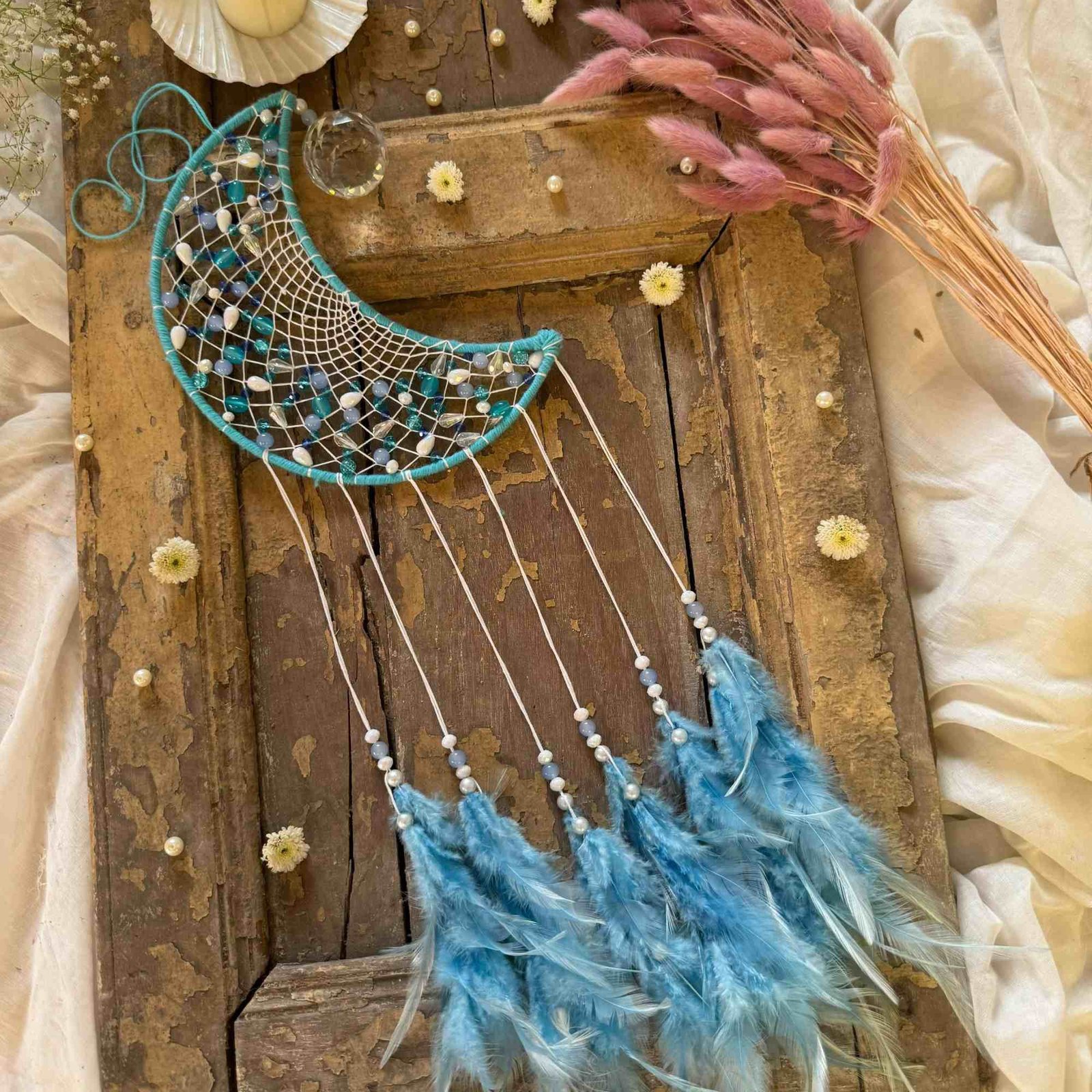 Description: Add a dreamy, bohemian touch to any space with our Crescent Bohemian Suncatcher Multi. Crafted from beads, threads, capiz shells, crystals, and soft white feathers, this exquisite piece features calming shades of lavender, baby pink, blue, and turquoise. It brings warmth, charm, and a pop of color to your room décor, making it a perfect gift or self-indulgence for those who love whimsical designs.