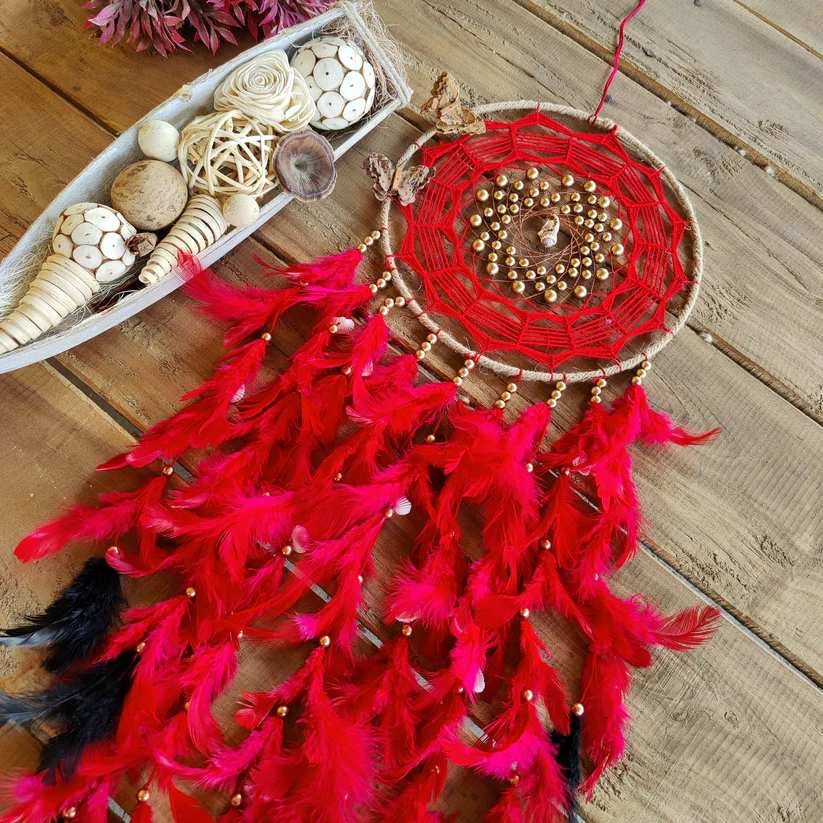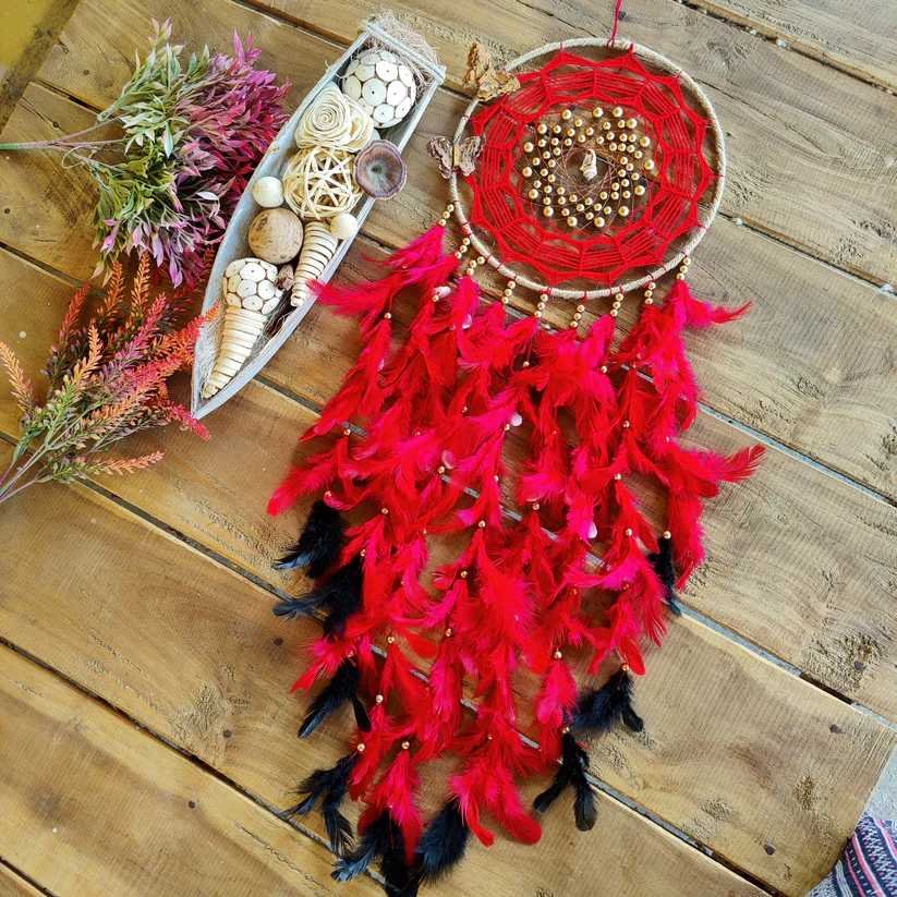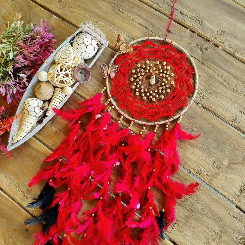 Infuse a bold burst of color and positive energy into any space with the Crimson Spark Dreamcatcher. Crafted from steel rings, vibrant red threads, and soft feathers, this dreamcatcher brings a lively yet soothing presence to your room. Its radiant red tones create a striking focal point while adding a touch of boho elegance.