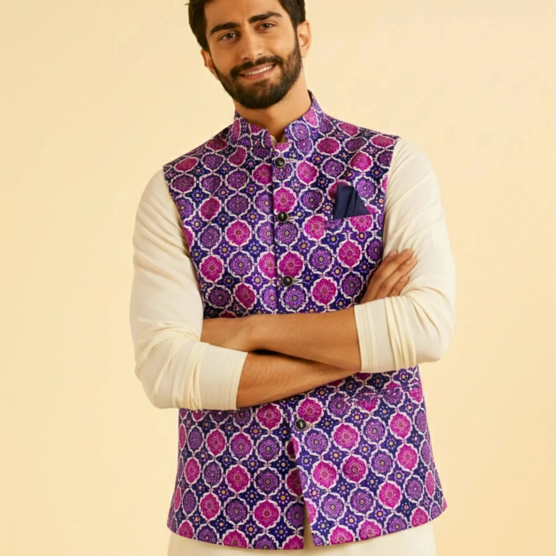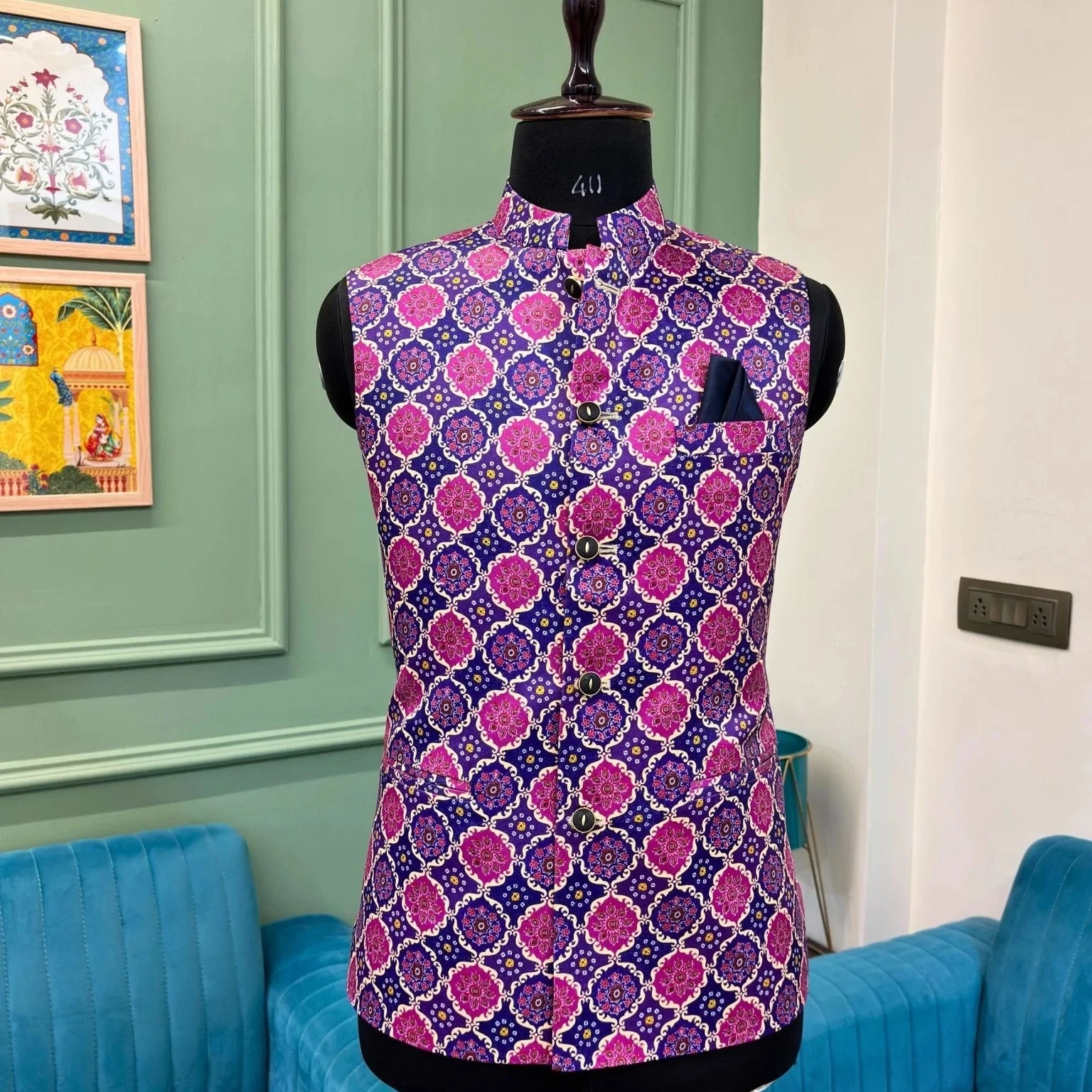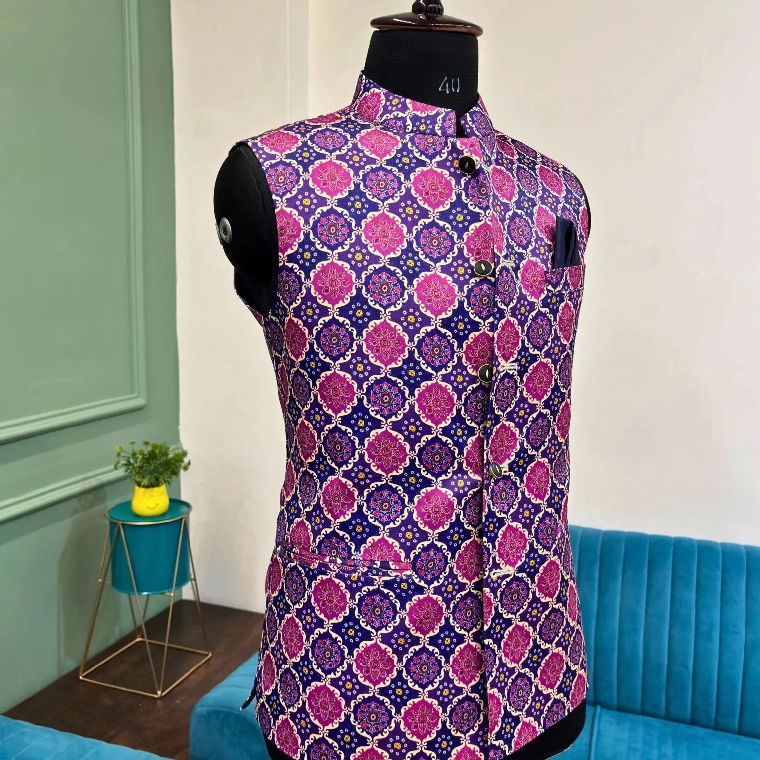 Elevate your ethnic wardrobe with the Cultural Fusion Nehru/Modi Jacket — a hip-length, mandarin-collar jacket designed for festive celebrations and wedding occasions. Crafted with a bold printed motif and tailored for a structured fit, it delivers standout styling while remaining comfortable and approachable. Pair it over a kurta or smart shirt for a refined fusion look.