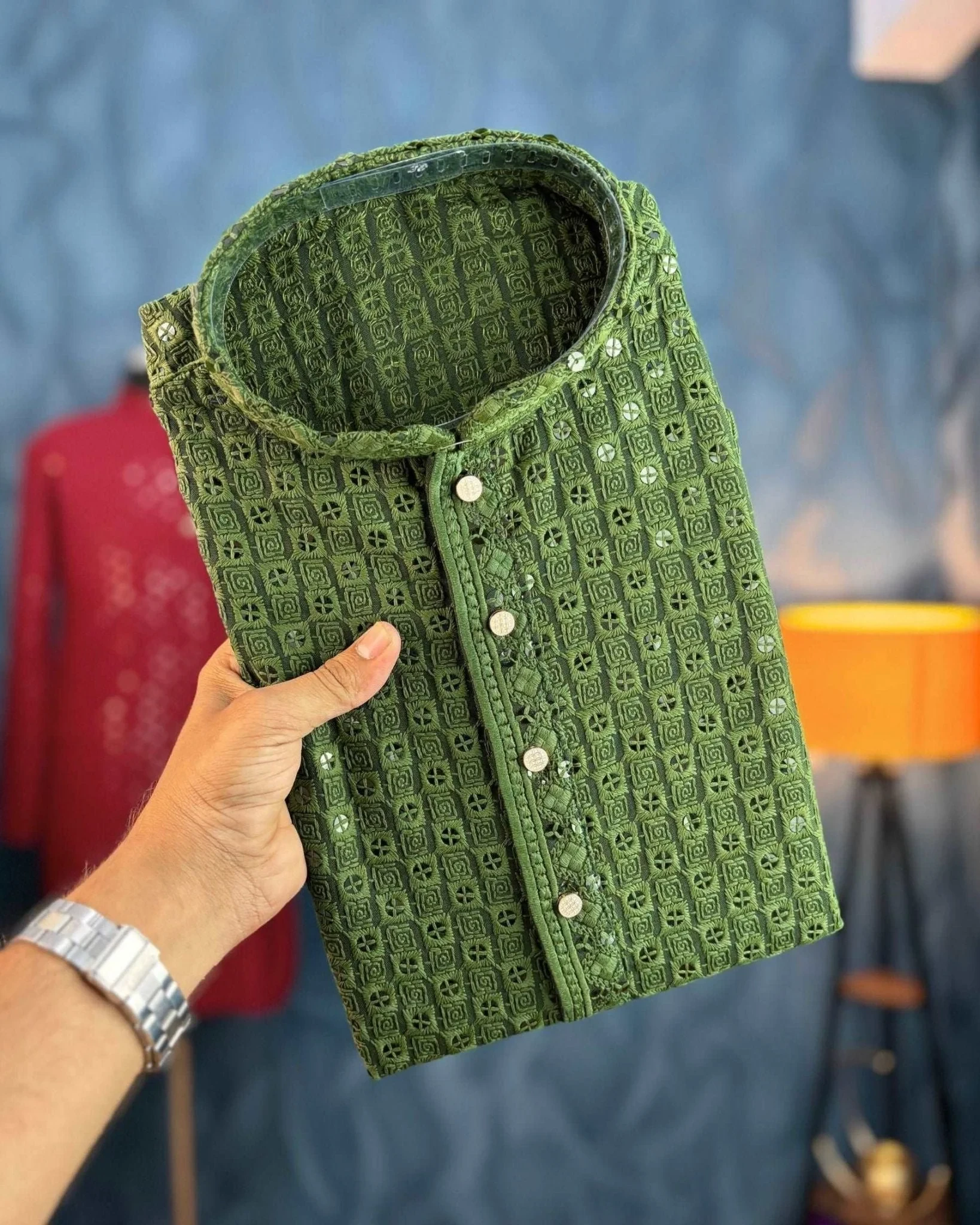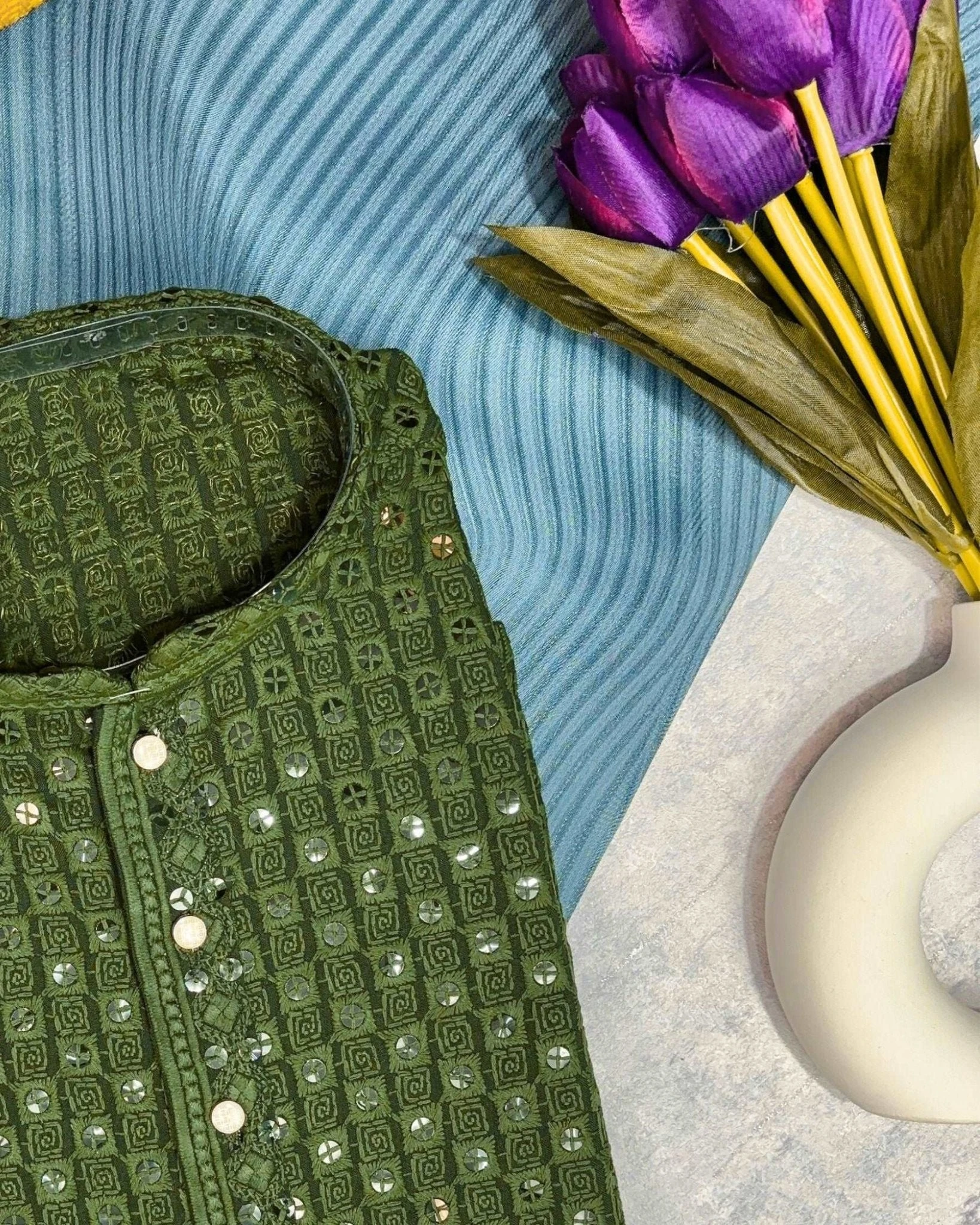 Add refined flair to your ethnic wardrobe with the Dark Mehandi Green Chikankari Sequinned Kurta. Crafted in a rich mehandi-green hue, this kurta features intricate traditional chikankari embroidery accentuated with subtle sequin detailing—bringing together cultural craftsmanship and discreet shimmer. Made from premium breathable cotton, the full-sleeve, straight-cut silhouette with mandarin (band) collar provides both comfort and presence, making it ideal for weddings, festive events, or elevated casual occasions.