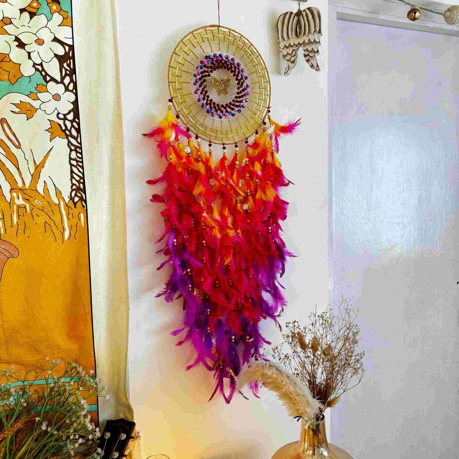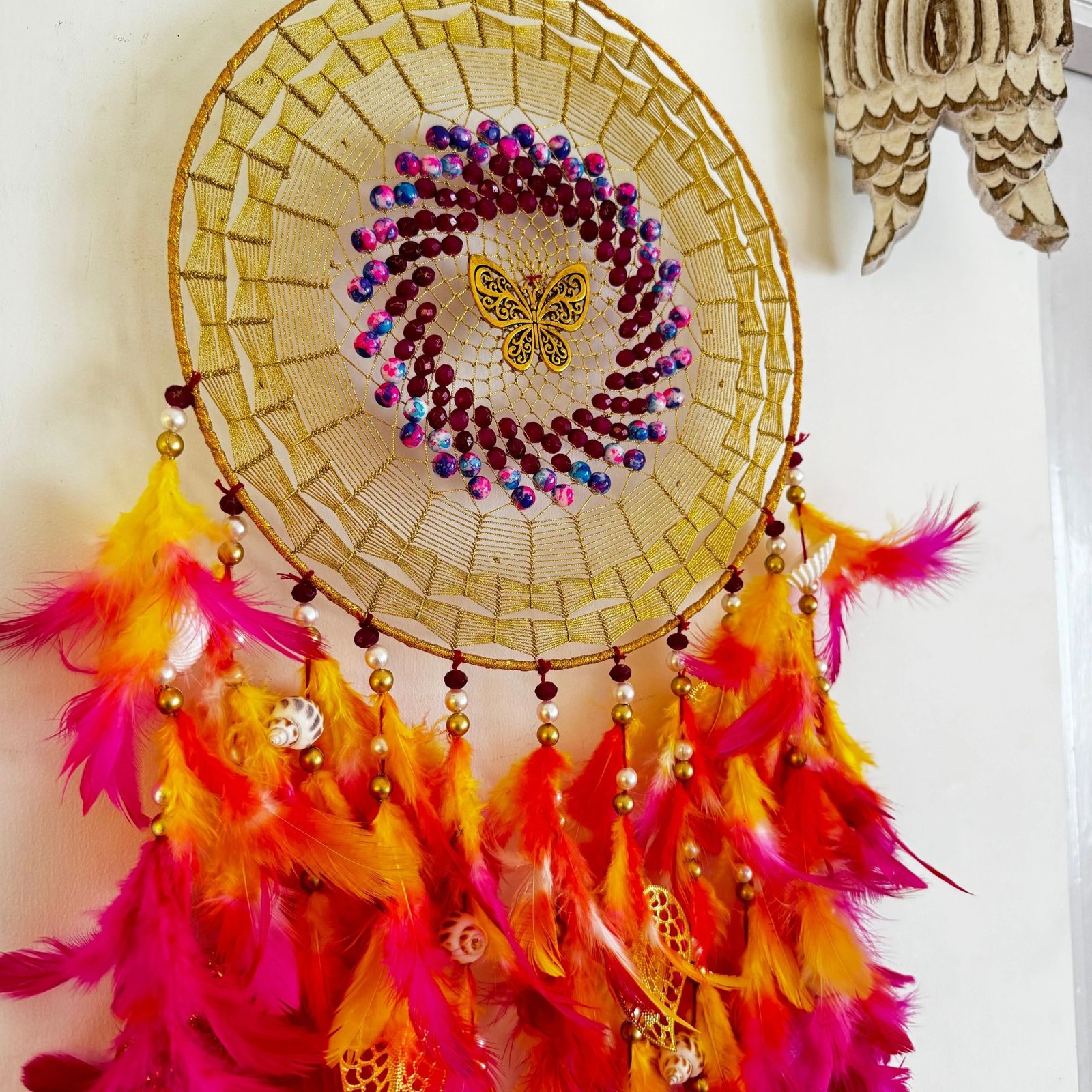 Bring a touch of elegance and boho charm to your space with the Delilah Golden Dreamcatcher. Crafted with a golden ring and intricate cobweb work, it features high-quality feathers, metal charms, and delicate capiz shells hanging below. The dreamy shades of yellow, pink, and magenta make it a vibrant statement piece, perfect for brightening any room. Ideal as a self-gift or for friends and family on birthdays or special occasions.