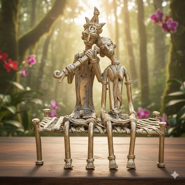 The artwork sits gracefully on a handcrafted cot-like base, adding rustic authenticity to its overall appearance. Ideal for your living room, pooja room, office table, or gift collection, this Dhokra showpiece symbolizes love, harmony, and divine connection.