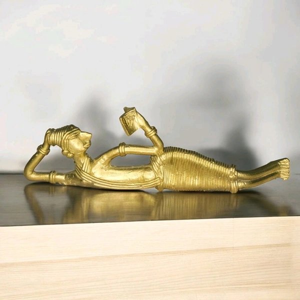 Add a touch of timeless elegance and cultural charm to your living space with the Dhokra Crafts Home Decor - Reading Book on Side Sleeping. Meticulously handcrafted using the ancient Dhokra art technique, this unique decor piece is a stunning fusion of tradition and modern aesthetics. Perfect for book lovers, art enthusiasts, or anyone looking to elevate their home interiors, this sculpture exudes warmth and creativity.